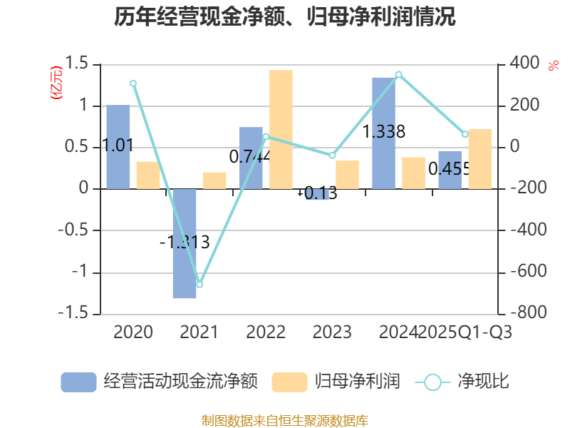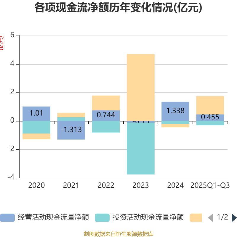 2025年前三季度,公司经营活动现金流净额为4550.82万元,同比下降7.39%;筹资活动现金流净额1.28亿元,同比增加2245万元;投资活动现金流净额-3119.48万元,上年同期为3006.14万元。