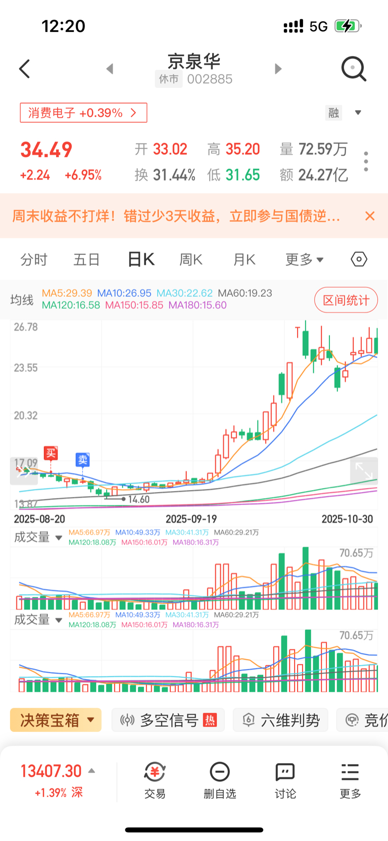 $京泉华(SZ002885)$ 天天看盘真没好处,今年错过了多少