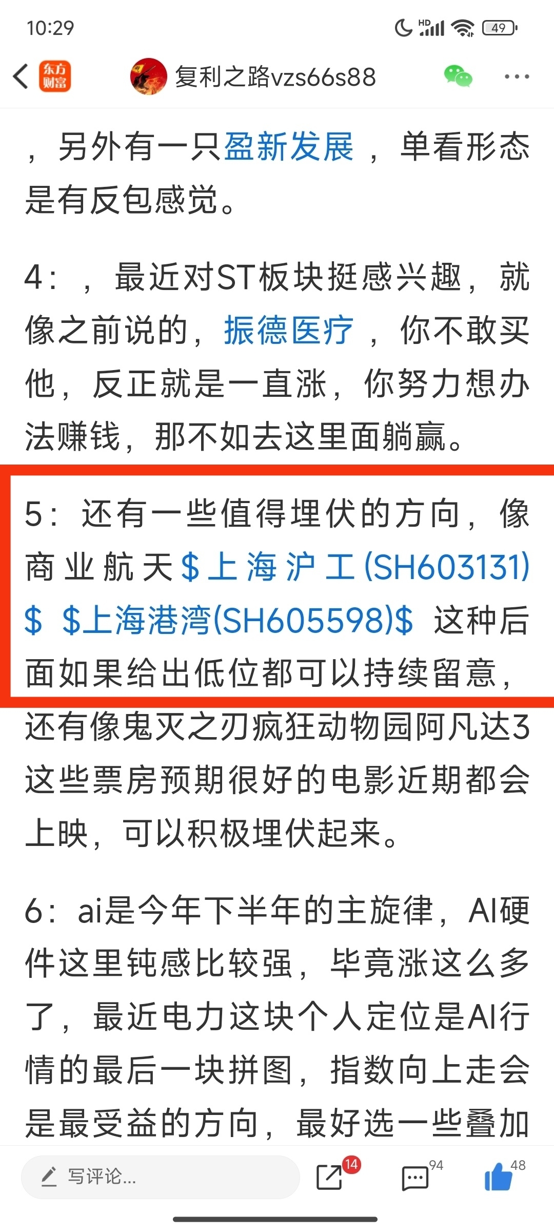 5:搞清两大主线内部节奏,就像今天天际的低吸,或者昨天合富中国 的弱转强;另外就还是多往低位瞅瞅,消费位置高了,可以多留意下新东西,商业航天说了也有几天了,像$上海沪工(SH603131)$ 上海港湾这种沿着五日线埋伏的话今天下午这波拉升也能吃到。