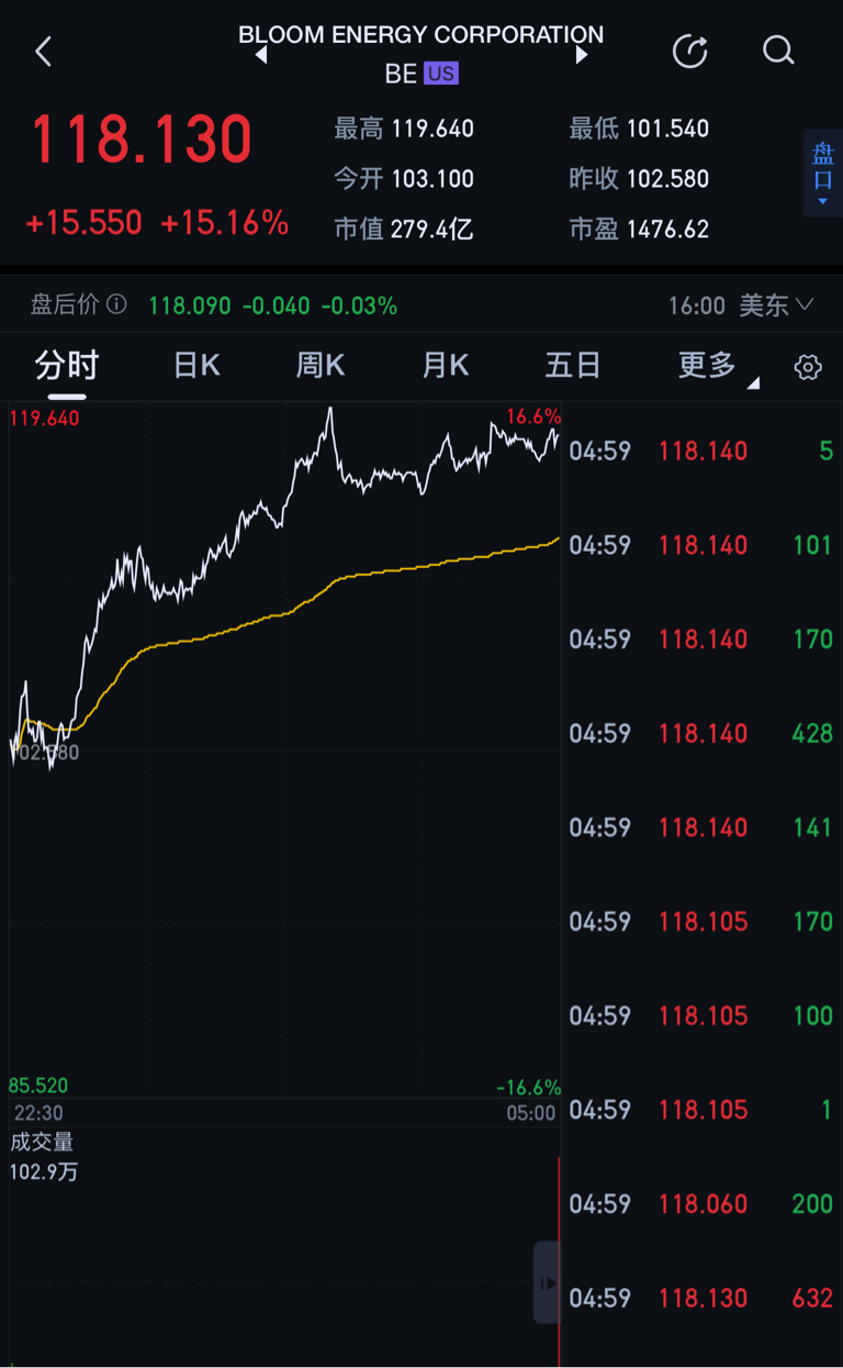 $京泉华(SZ002885)$ 美股BE公司大涨 15%