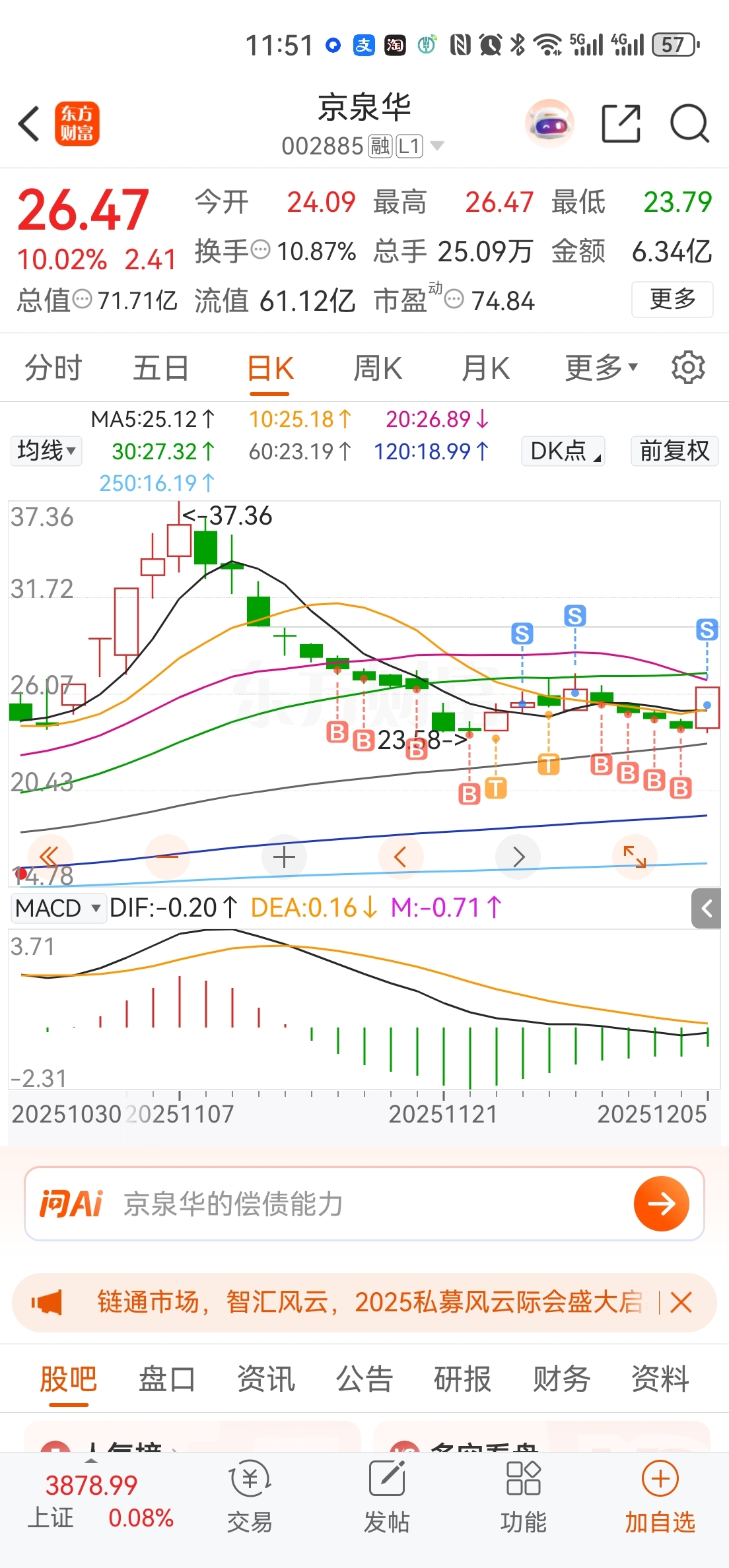 $京泉华(SZ002885)$ 出了半仓,下周冲高回落25左右再进