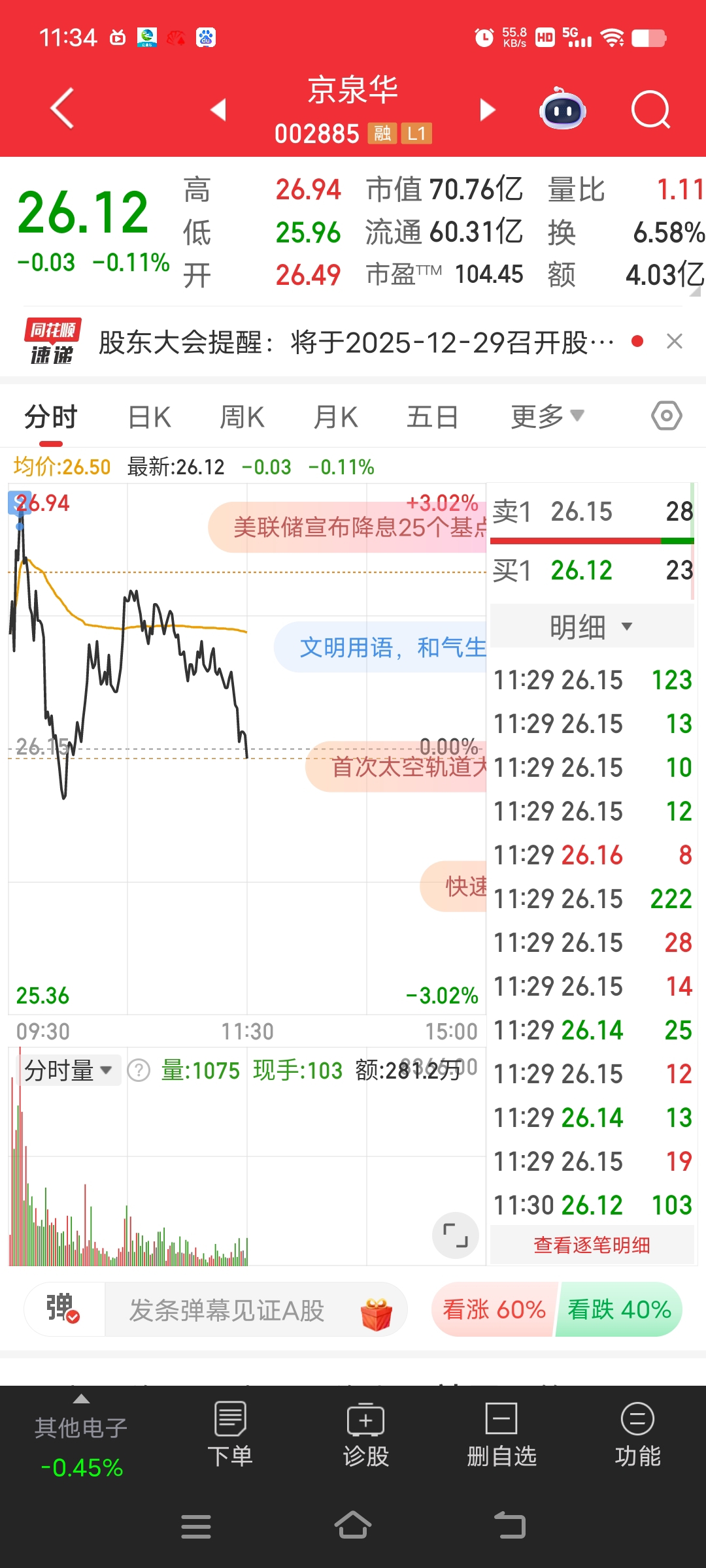 $京泉华(SZ002885)$ 好消息:早盘冲高卖了,坏消息:只卖了一半