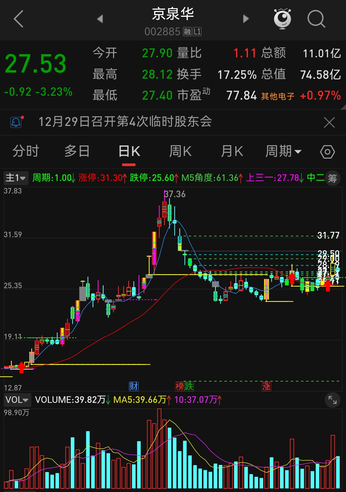 $京泉华(SZ002885)$ 一波趋势上涨后回调到前期换手区附近,目前做箱体盘整,且有涨停基因,最近重心开始上移。
