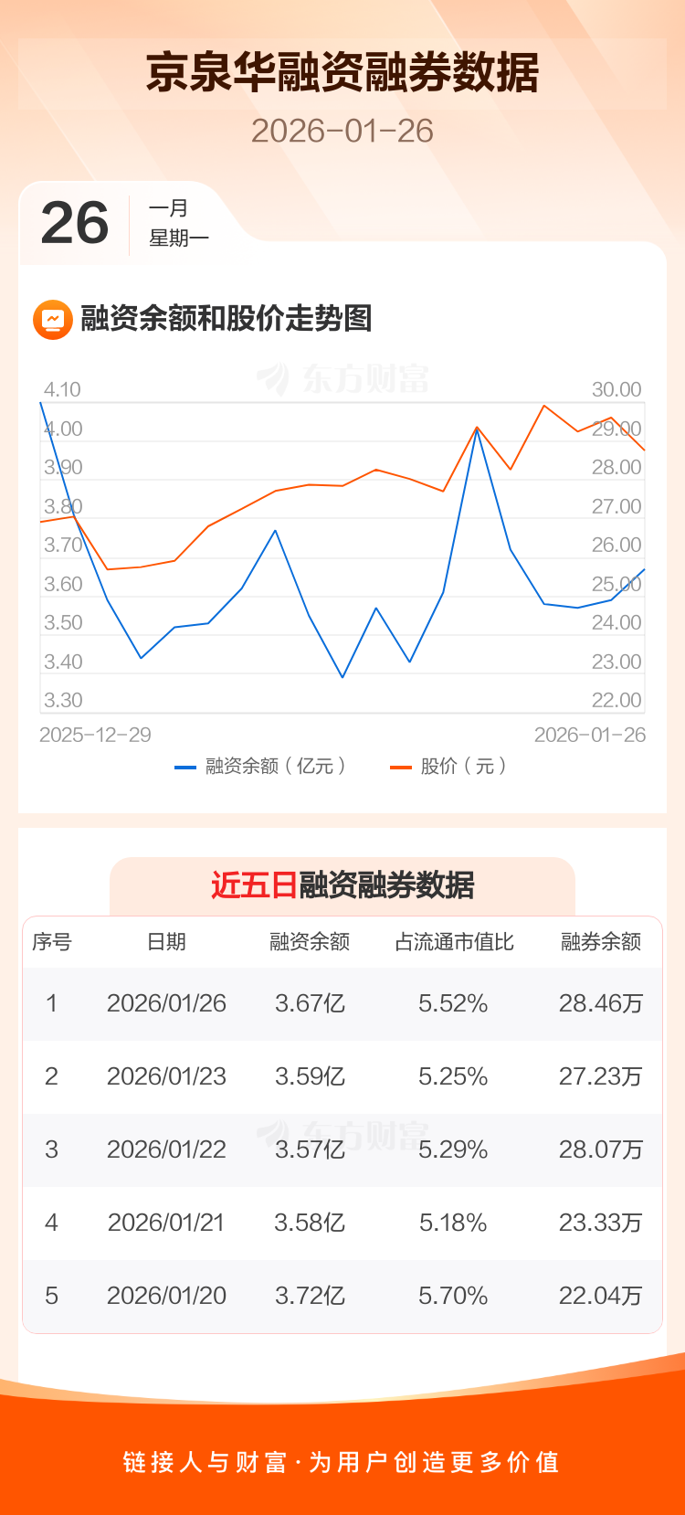 交易所最新数据显示,京泉华于2026年1月26日获融资买入5912.20万元,融资偿还5123.76万元,当日融资净买入788.44万元。目前,该股融资余额3.67亿,占流通市值比例为5.52%。