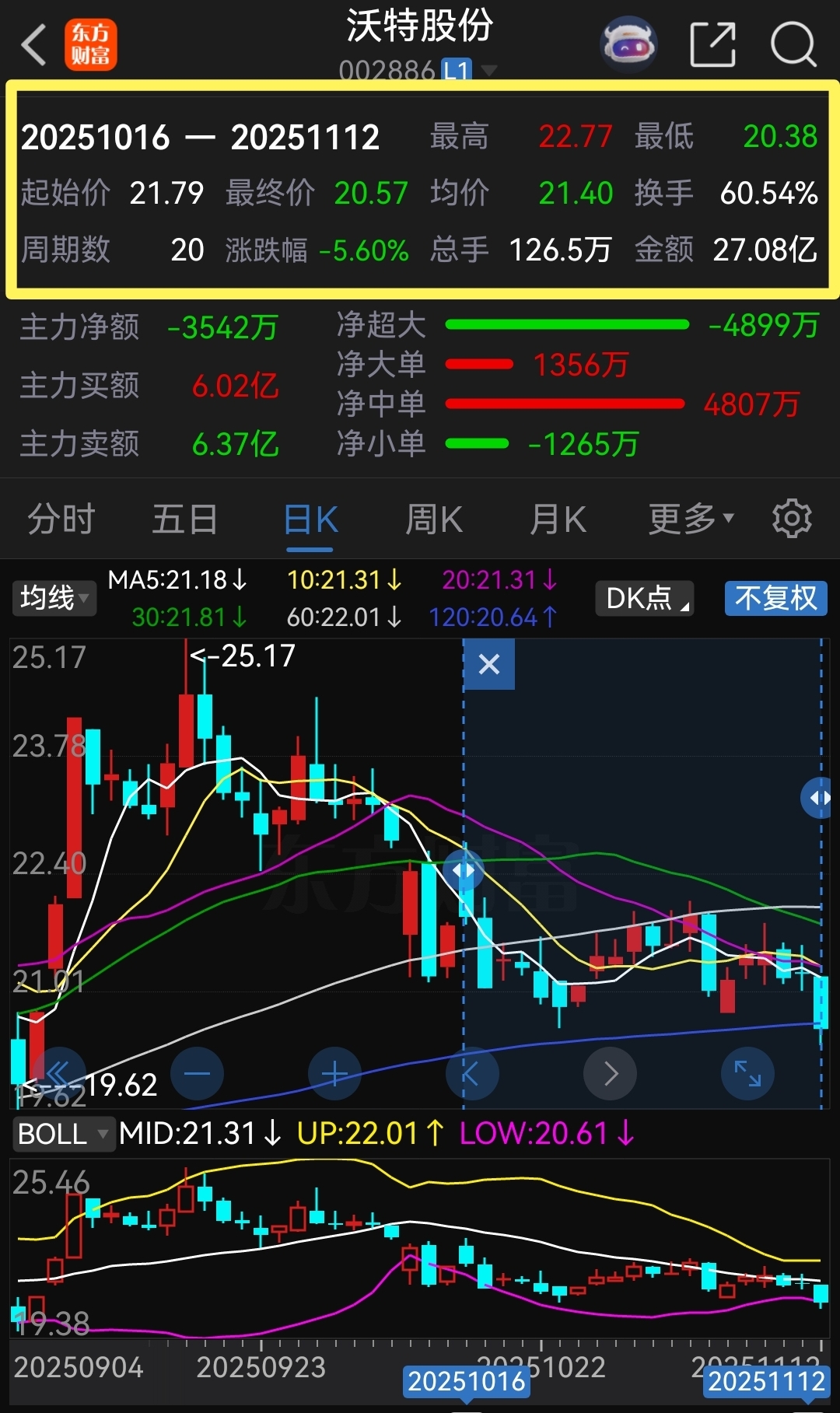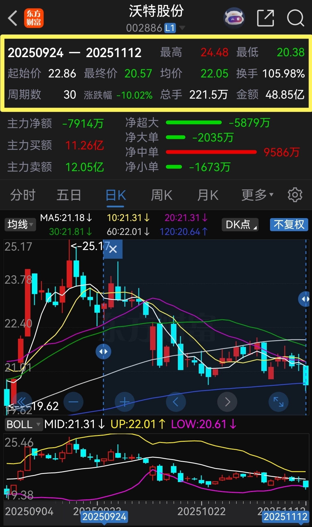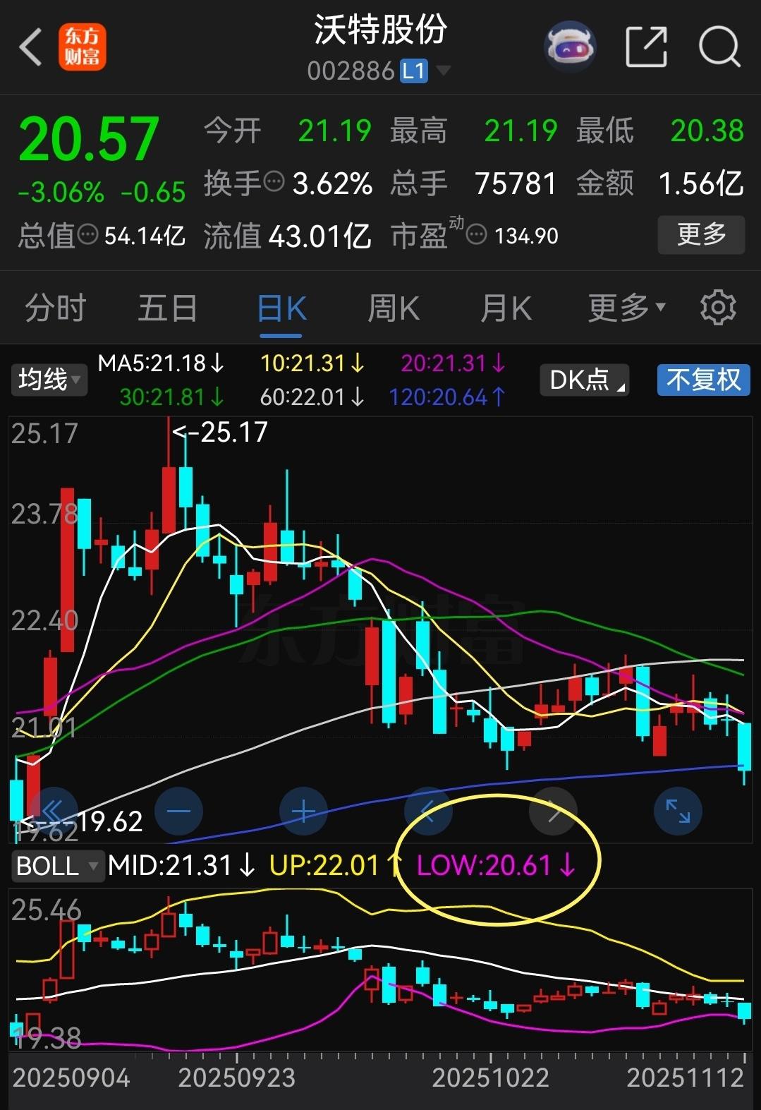 $沃特股份(SZ002886)$ 沃特在今天盘中最低价20.38元,再次击穿了BOLL线下轨20.61元,收盘价20.57元仍处布林线下轨之下!沪深两市的金典战例!在基本面,财务报表没有什么大问题!成交量换手充分,远低于区间交易的持股成本价均价,当股价击穿布林线下轨之时,是千载难逢捡钱的大好机会!机不可失,失不再来!并且屡试不爽!拭目以待!