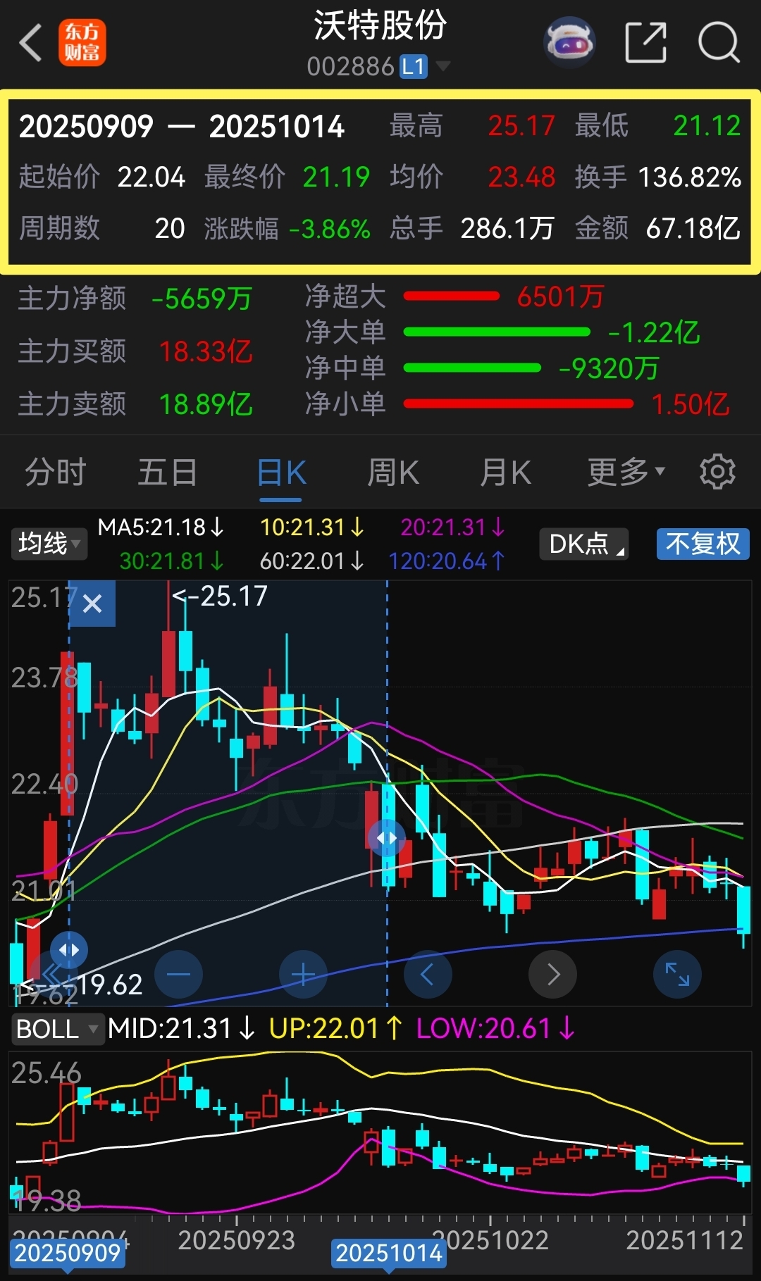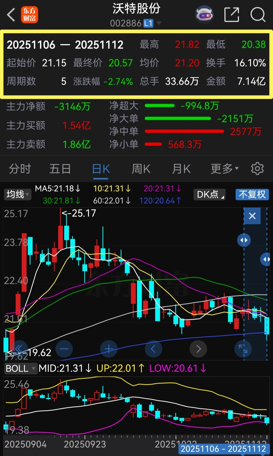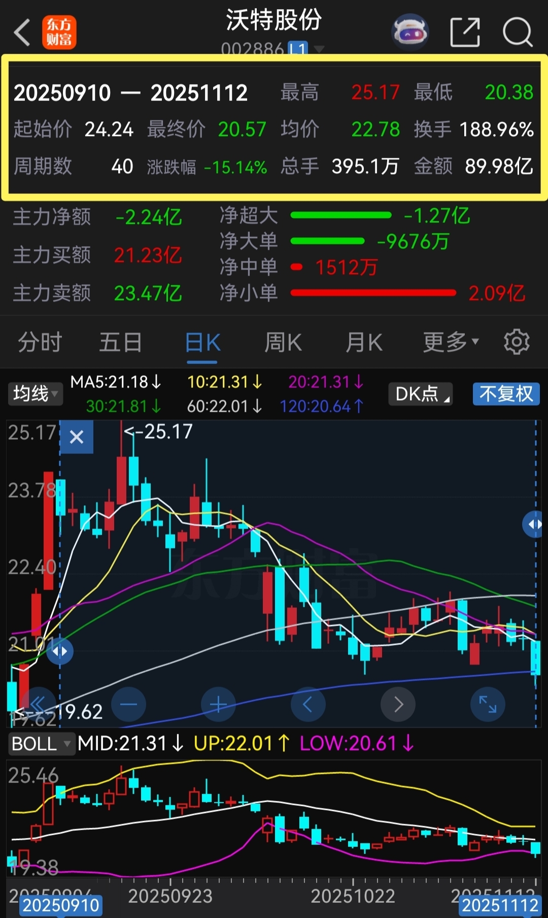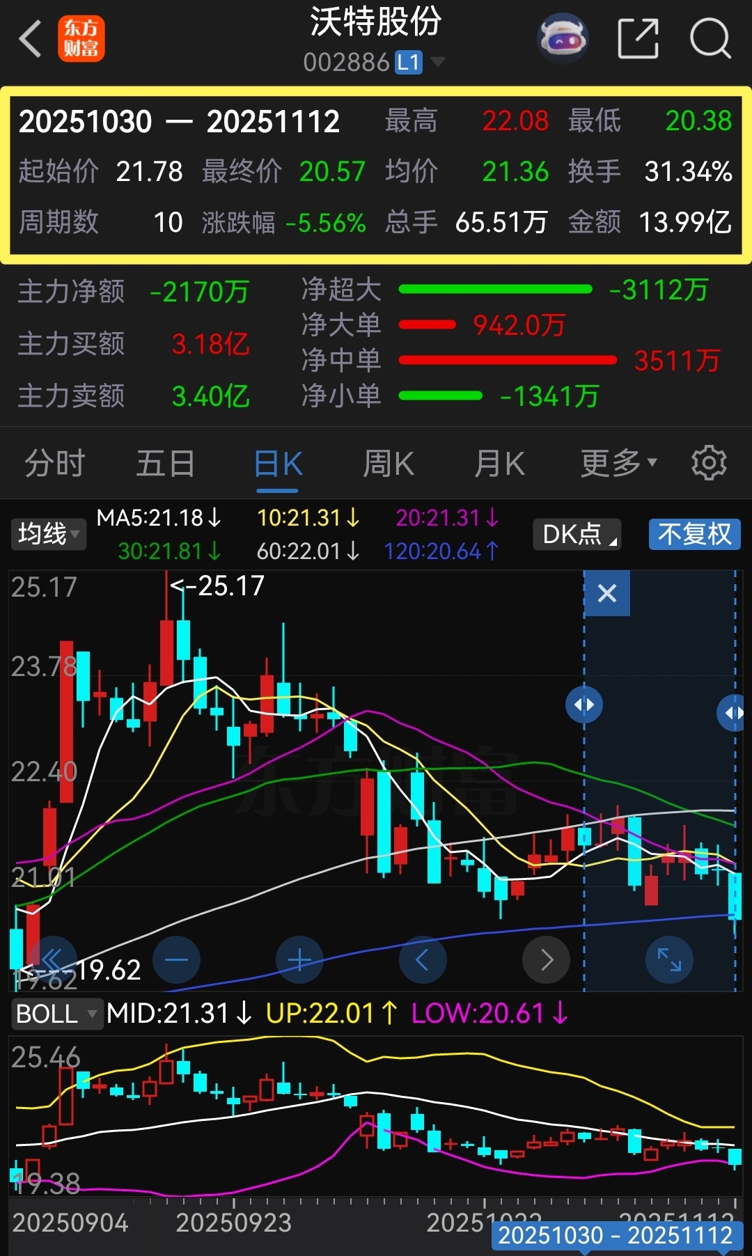 $沃特股份(SZ002886)$ 沃特在今天盘中最低价20.38元,再次击穿了BOLL线下轨20.61元,收盘价20.57元仍处布林线下轨之下!沪深两市的金典战例!在基本面,财务报表没有什么大问题!成交量换手充分,远低于区间交易的持股成本价均价,当股价击穿布林线下轨之时,是千载难逢捡钱的大好机会!机不可失,失不再来!并且屡试不爽!拭目以待!