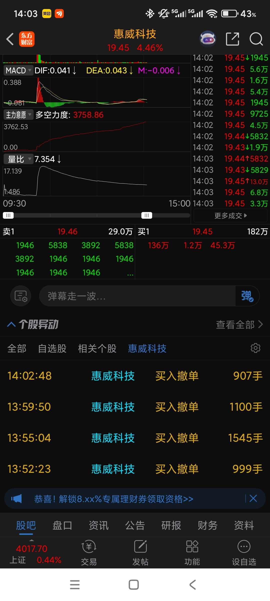 $惠威科技(SZ002888)$ 拖不住就撤单