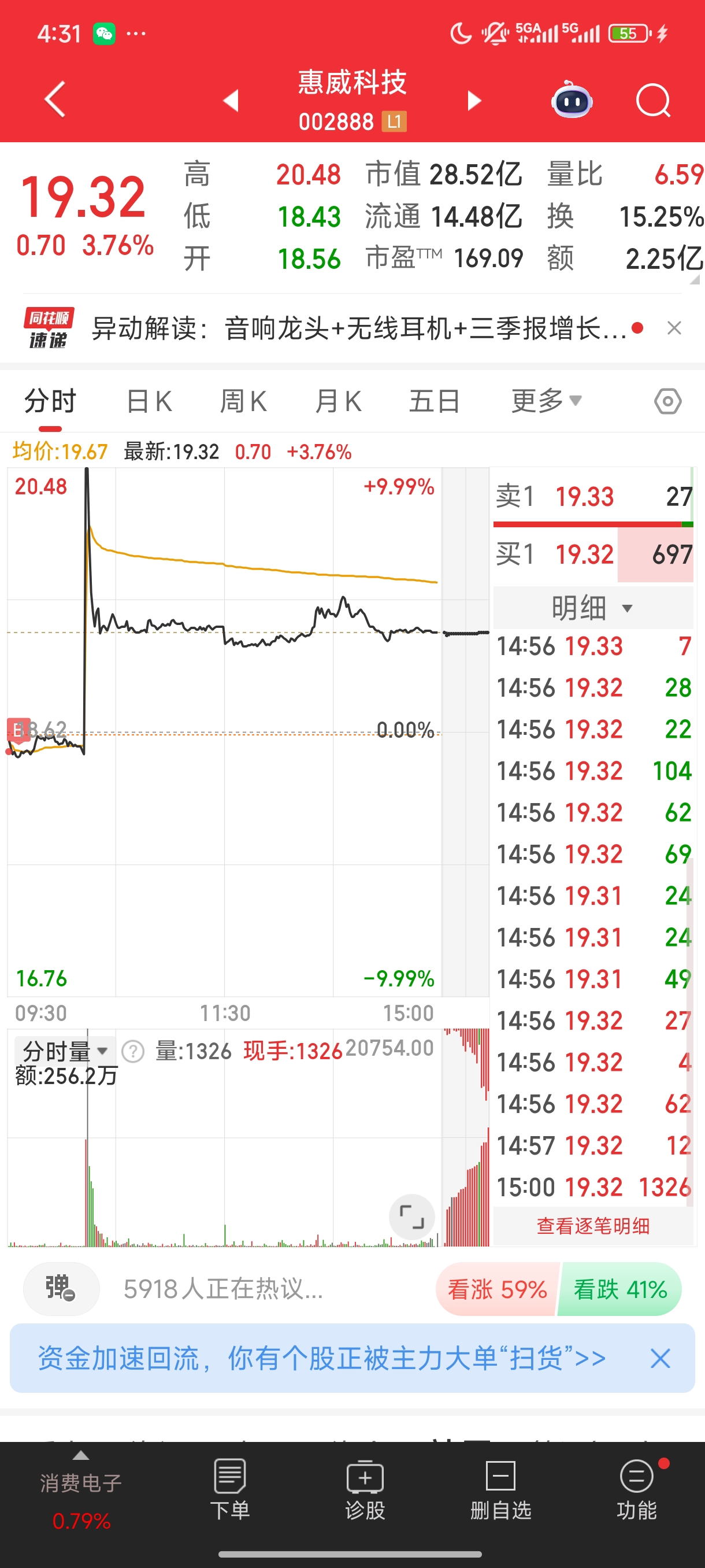 $惠威科技(SZ002888)$ 买了不能卖,明天低开就白玩了
