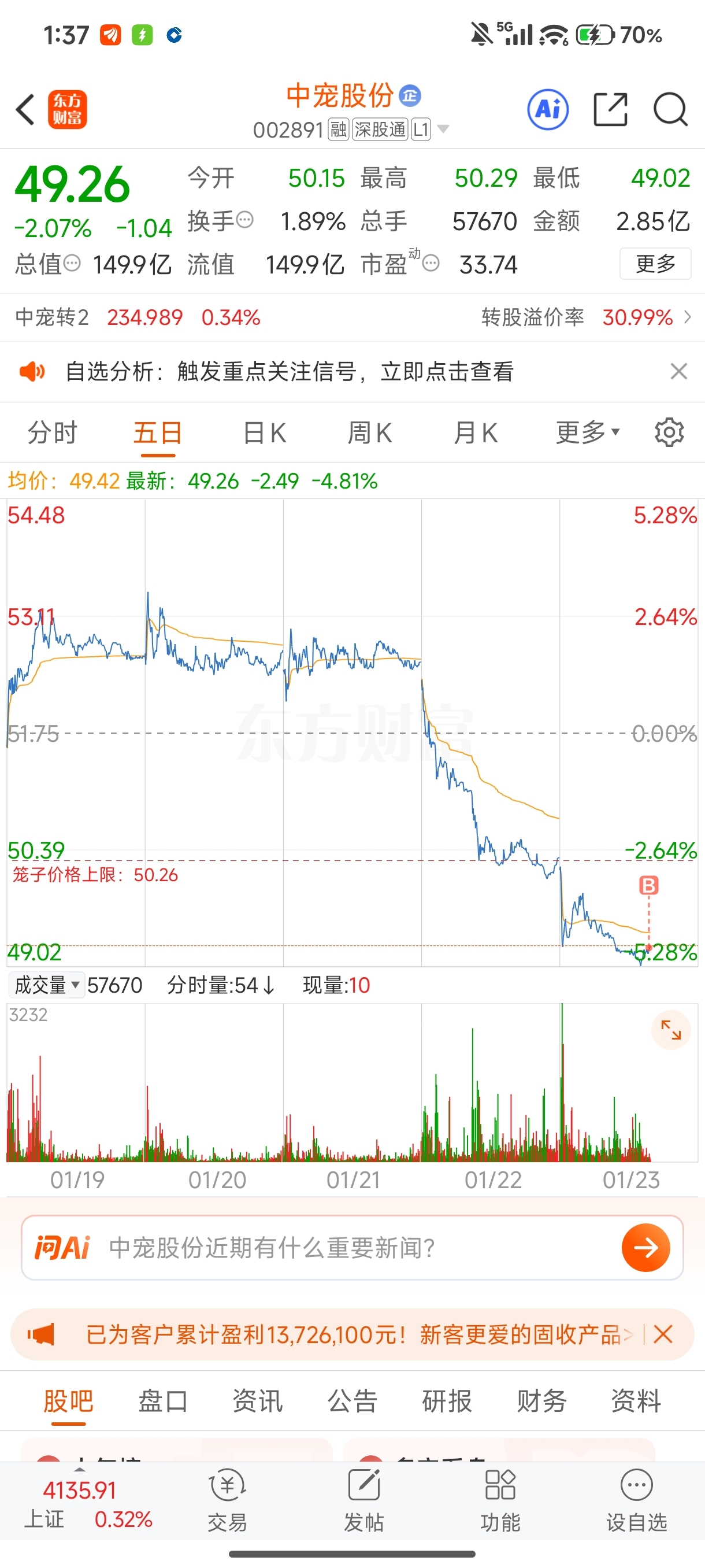 $中宠股份(SZ002891)$ 买一点打个底,52就走