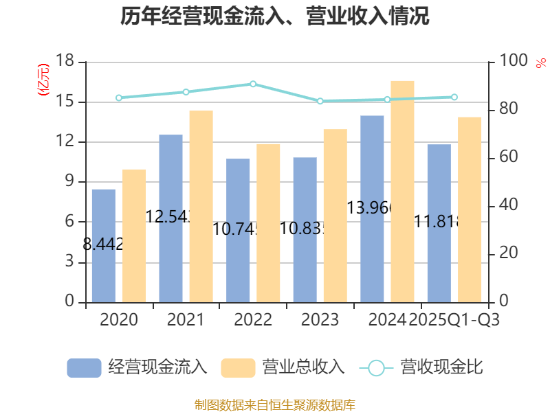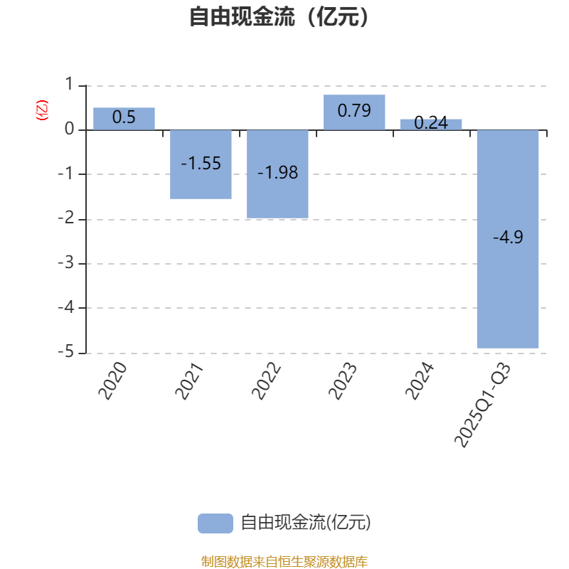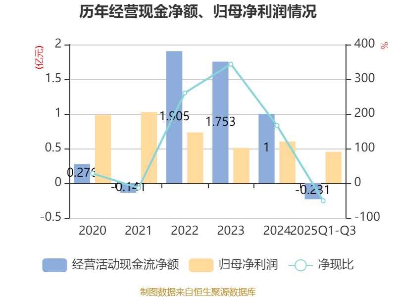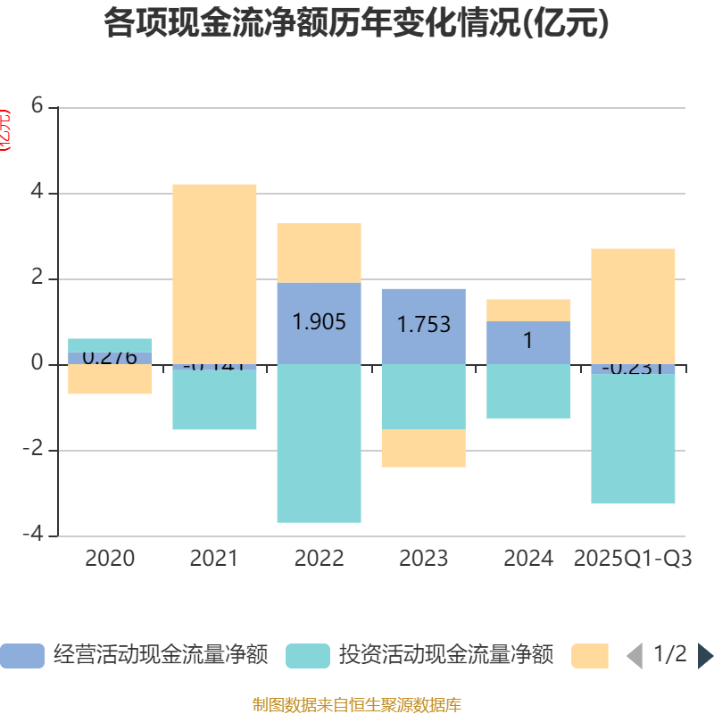 2025年前三季度,公司经营活动现金流净额为-2305.03万元,同比减少8828万元;筹资活动现金流净额2.69亿元,同比增加2.41亿元;投资活动现金流净额-3.02亿元,上年同期为-1.12亿元。
