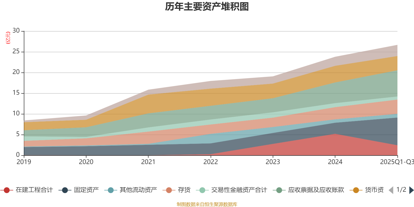 资产重大变化方面,截至2025年三季度末,公司固定资产较上年末增加149.38%,占公司总资产比重上升13.82个百分点;在建工程合计较上年末减少53.52%,占公司总资产比重下降12.72个百分点;货币资金较上年末减少14.45%,占公司总资产比重下降4个百分点;应收票据及应收账款较上年末增加26.91%,占公司总资产比重上升2.77个百分点。
