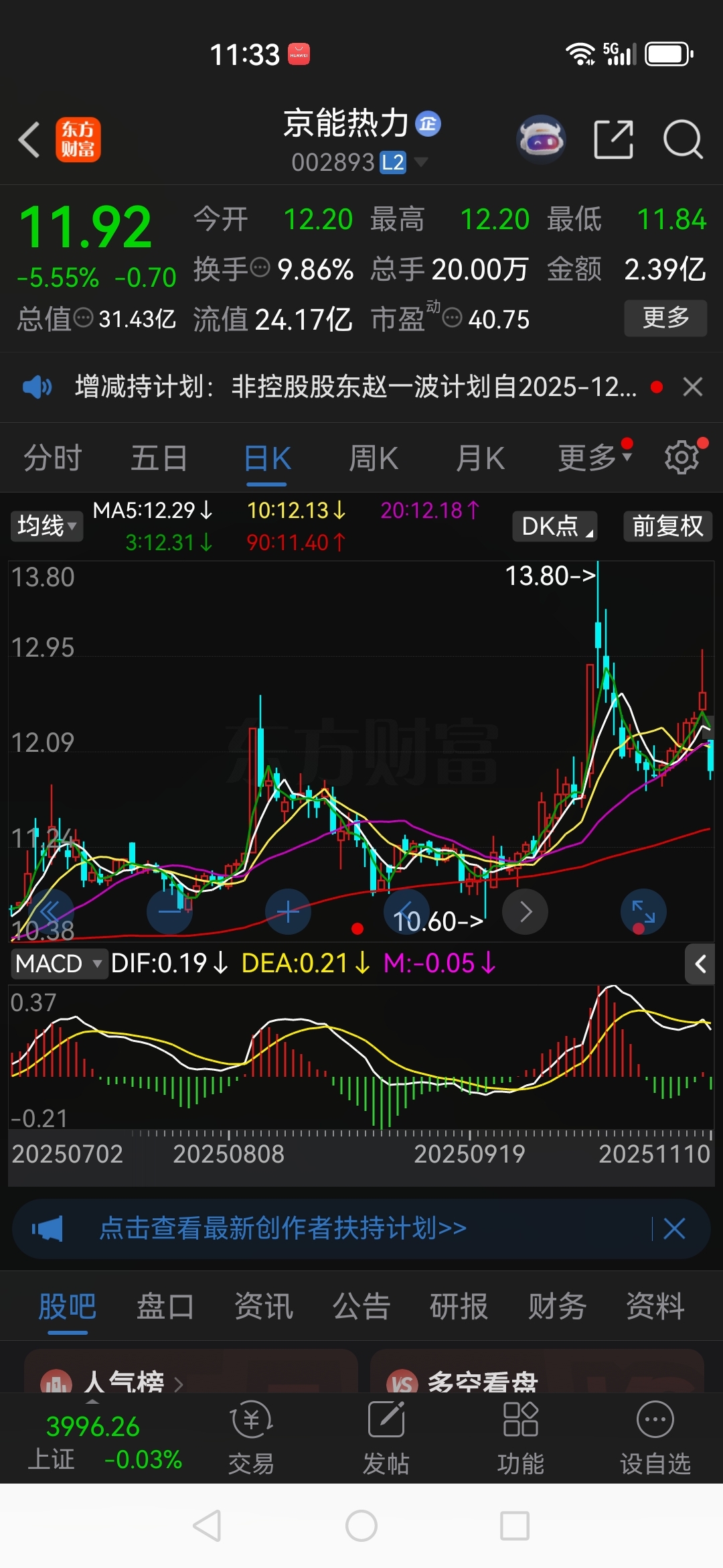 不要恐慌,下午2点半后收盘12.23附近,低位减持公告是利好,因为它要发布消息后