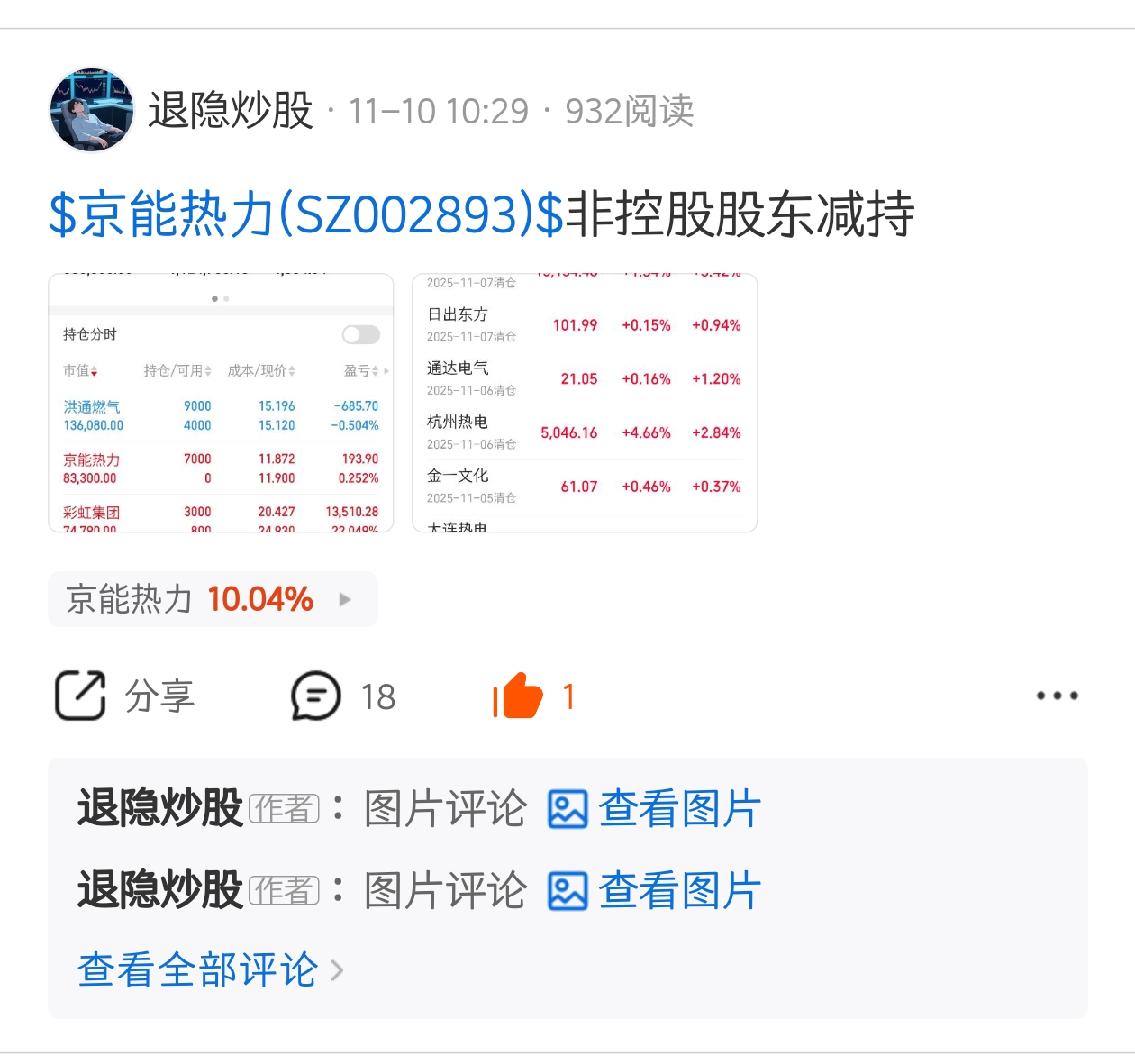 $京能热力(SZ002893)$ 非控股股东减持,数量不是很大,一般不用担心。如果平开或者低开不多,要立马清仓。如果低开四五个点以上,果断买入。
