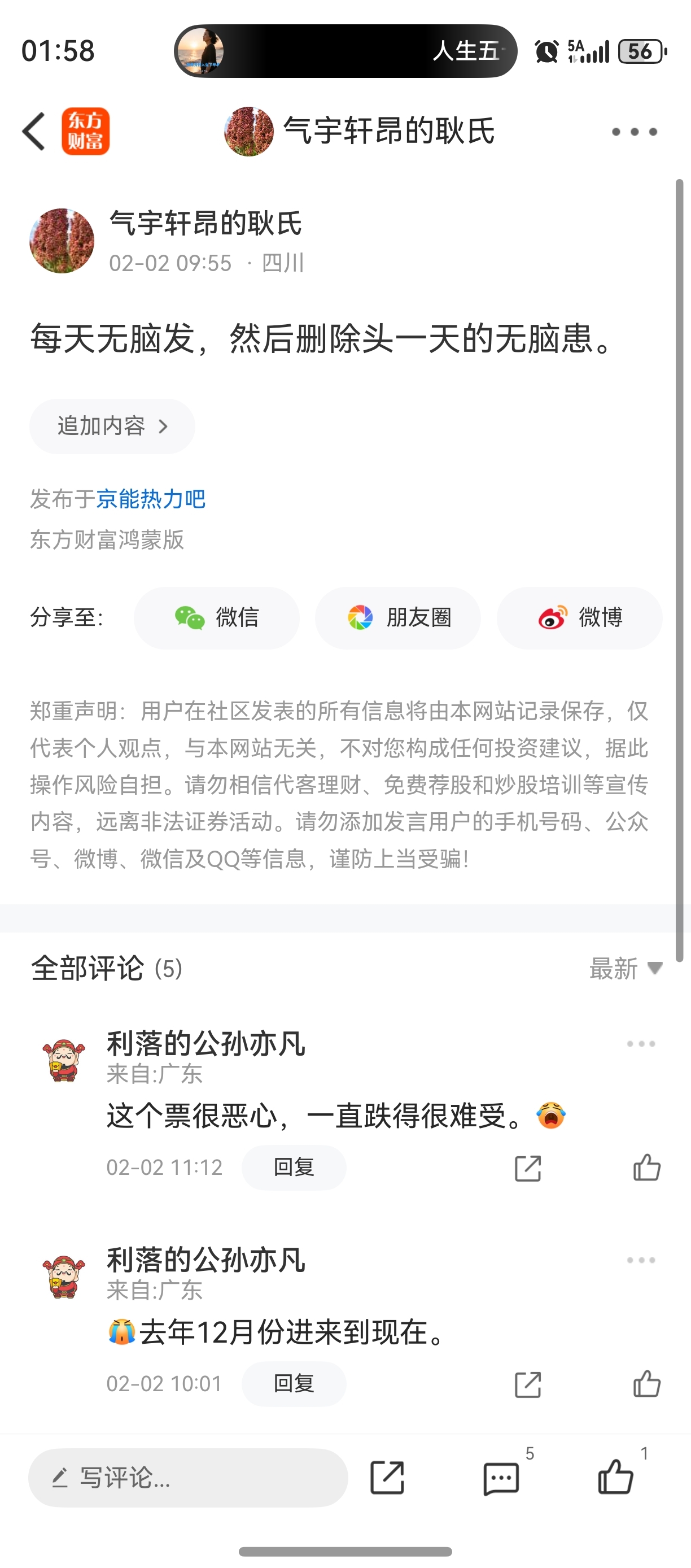 温馨提示: 1.根据《证券法》规定,禁止编造、传播虚假信息或者误导性信息,扰乱证券市场;2.用户在本社区发表的所有资料、言论等仅代表个人观点,与本网站立场无关,不对您构成任何投资建议。用户应基于自己的独立判断,自行决定证券投资并承担相应风险。《东方财富社区管理规定》