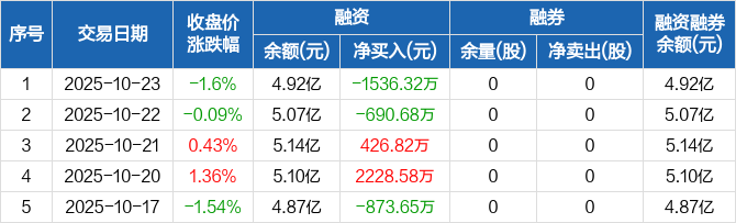 中大力德:融资净偿还1536.32万元,融资余额4.92亿元(10-23)