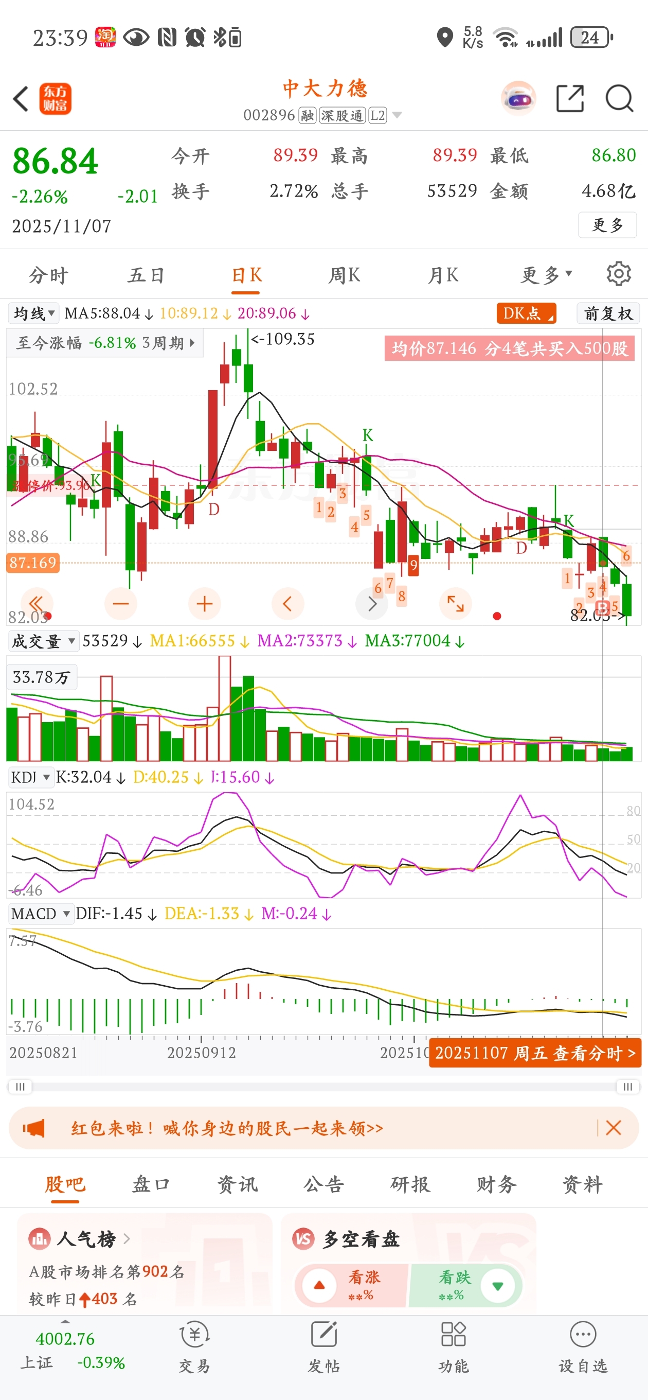 $中大力德(SZ002896)$ 手贱啊,好好拿的国光连锁卖了买这,不知道这次要回调多久,明天冲高就卖一半