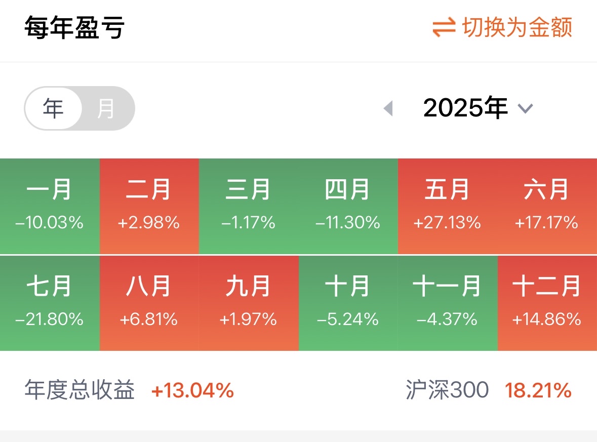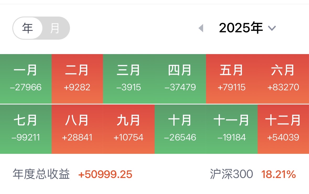 总结,以前亏的就算了,从2024年大亏了一半,近20万飞了,开始努力回本。2025年红了