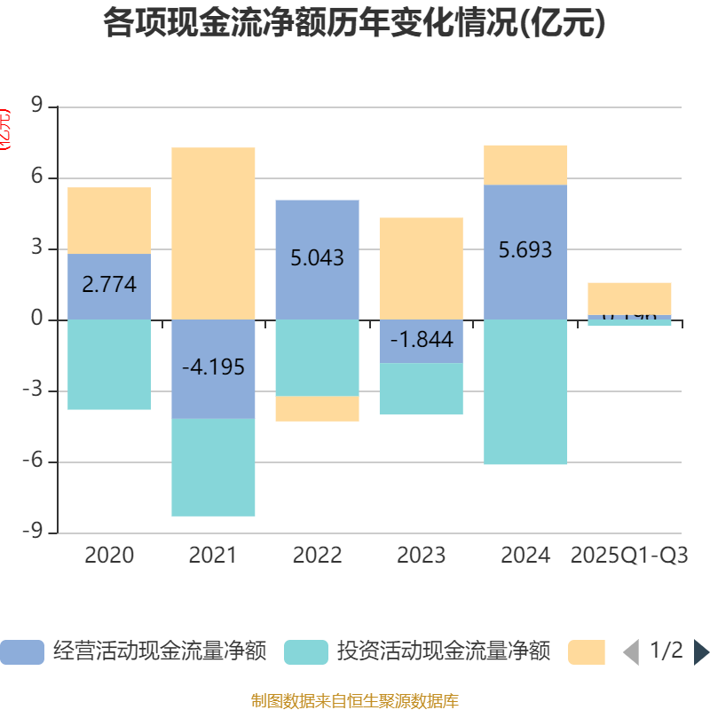 2025年前三季度,公司经营活动现金流净额为1958.26万元,同比下降95.32%;筹资活动现金流净额1.35亿元,同比减少9638.72万元;投资活动现金流净额-2650.12万元,上年同期为-2.52亿元。