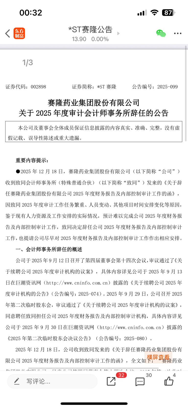 $*ST赛隆(SZ002898)$ 兄弟们,这个票要小心了,会计师事务所连夜跑路,参考之前的$*ST精伦(SH600355)$ ,出来很后三连跌停才开板,年底了,有很强的退市风险的票尽量少做,守住本做,不看底牌。