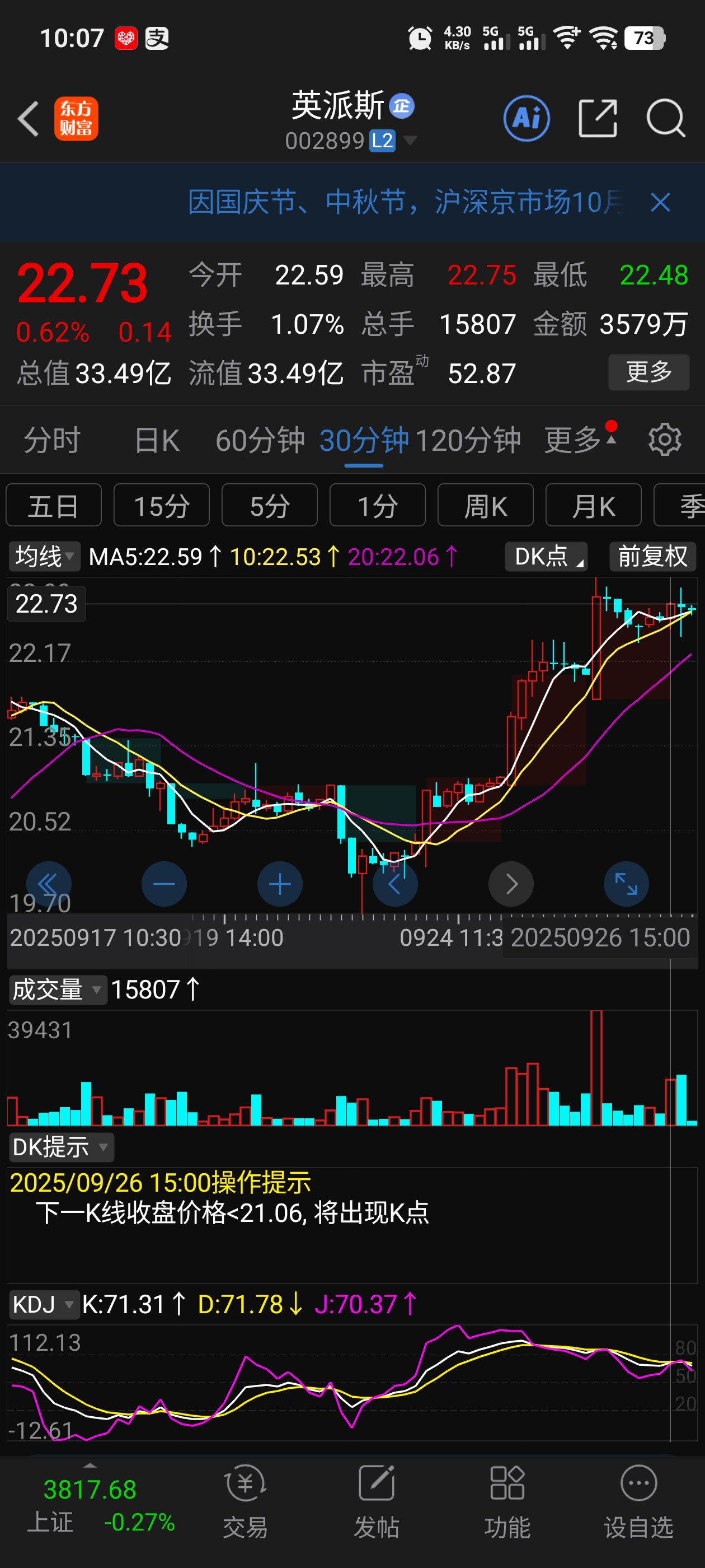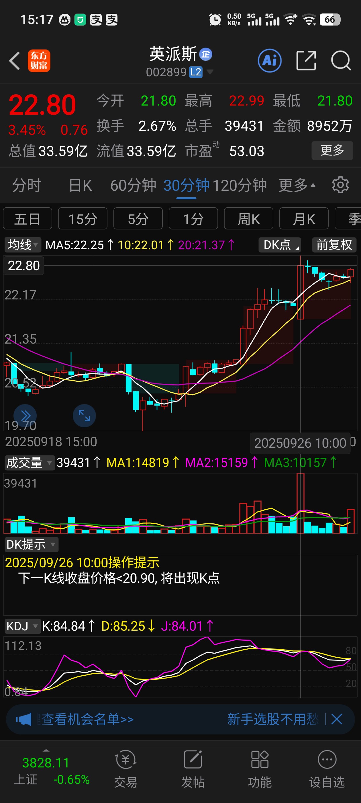 $英派斯(SZ002899)$ 明天看跌(原因,30分钟缩量上影线)