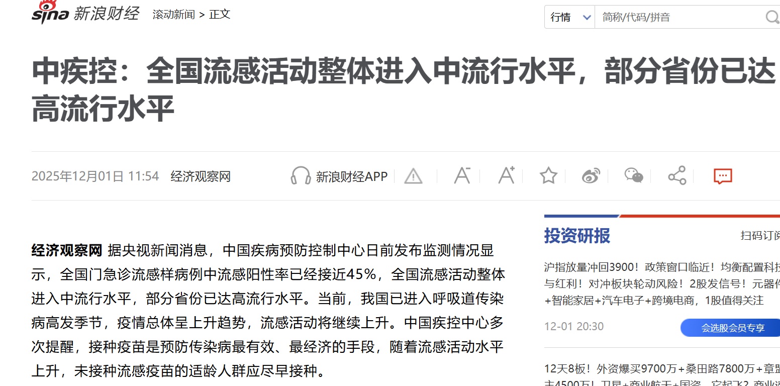 中疾控:全国流感活动整体进入中流行水平,部分省份已达高流行水平