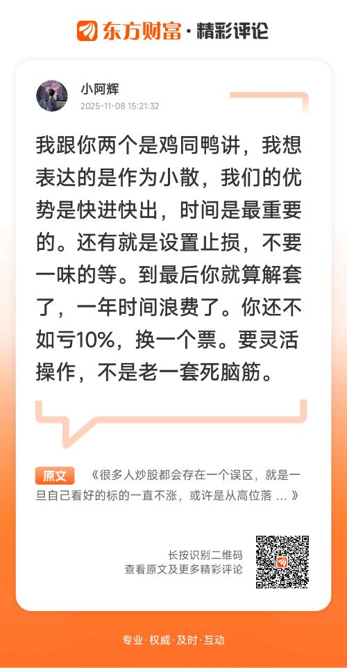 会快进快出的,会止损的早就出去了,不是所有人都是你所说这种想法的。另外,散户的时间是最不值钱的,哪有控盘的量化主力的时间金贵。与其说拿票的散户死脑筋,不如说是量化主力一厢情愿了。你是聪明人,别评论了。//@小阿辉 :我跟你两个是鸡同鸭讲,我想表达的是作为小散,我们的优势是快进快出,时间是最重要的。还有就是设置止损,不要一味的等。到最后你就算解套了,一年时间浪费了。你还不如亏10%,换一个票。要灵活操作,不是老一套死脑筋。