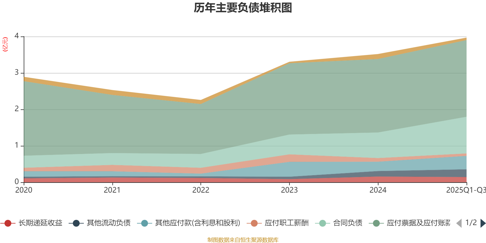 负债重大变化方面,截至2025年三季度末,公司合同负债较上年末增加43.41%,占公司总资产比重上升2.2个百分点;短期借款较上年末减少100%,占公司总资产比重下降0.83个百分点;其他应付款(含利息和股利)较上年末增加43.51%,占公司总资产比重上升0.8个百分点;其他流动负债较上年末增加42.09%,占公司总资产比重上升0.45个百分点。