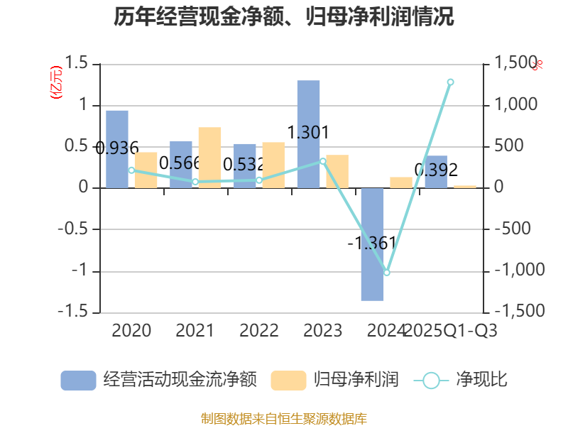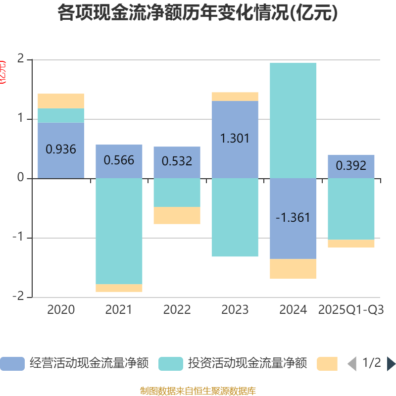 2025年前三季度,公司经营活动现金流净额为3920.77万元,同比增加1.46亿元;筹资活动现金流净额-1305.79万元,同比增加1872.71万元;投资活动现金流净额-1.04亿元,上年同期为1.14亿元。