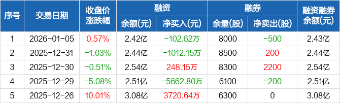 宇环数控:融资净偿还102.62万元,融资余额2.42亿元(01-05)