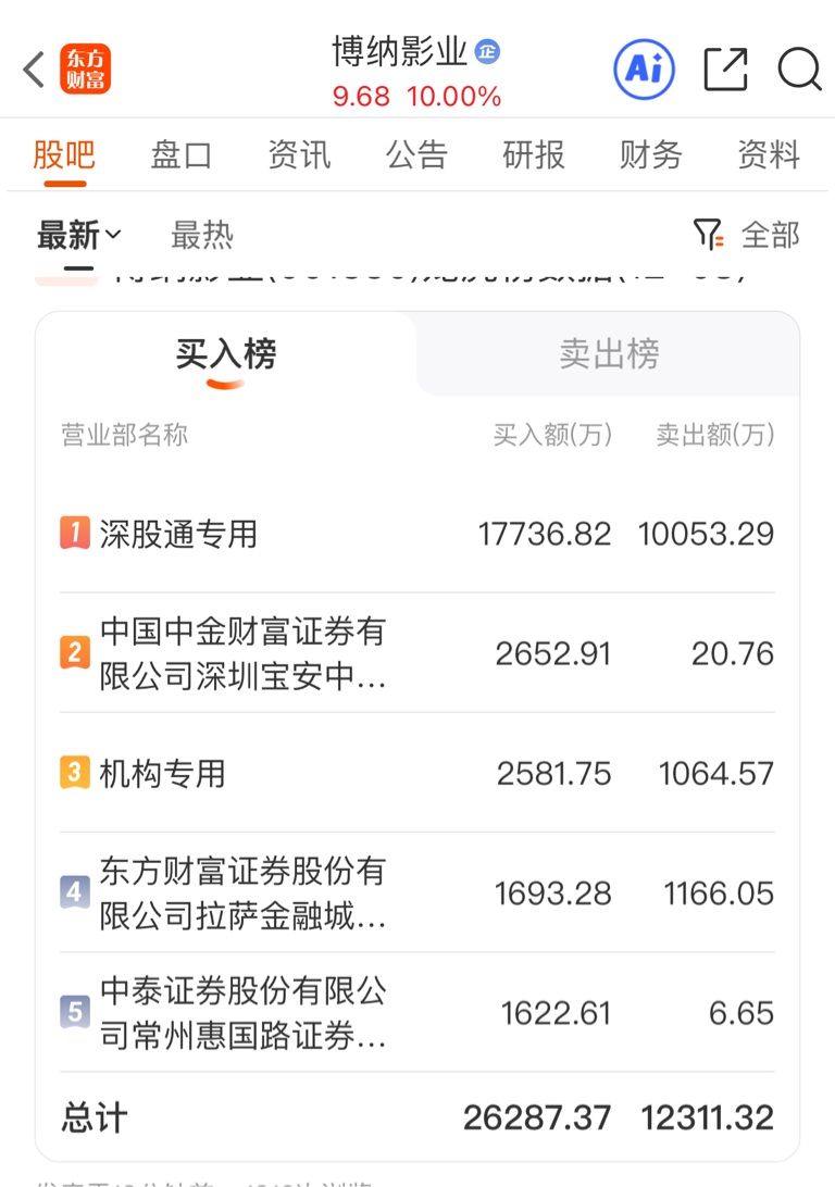 $金逸影视(SZ002905)$ 博纳的买入榜!一帮大老虎!群星荟萃!我看到后是胆怯!一股没买!看透不说透!
