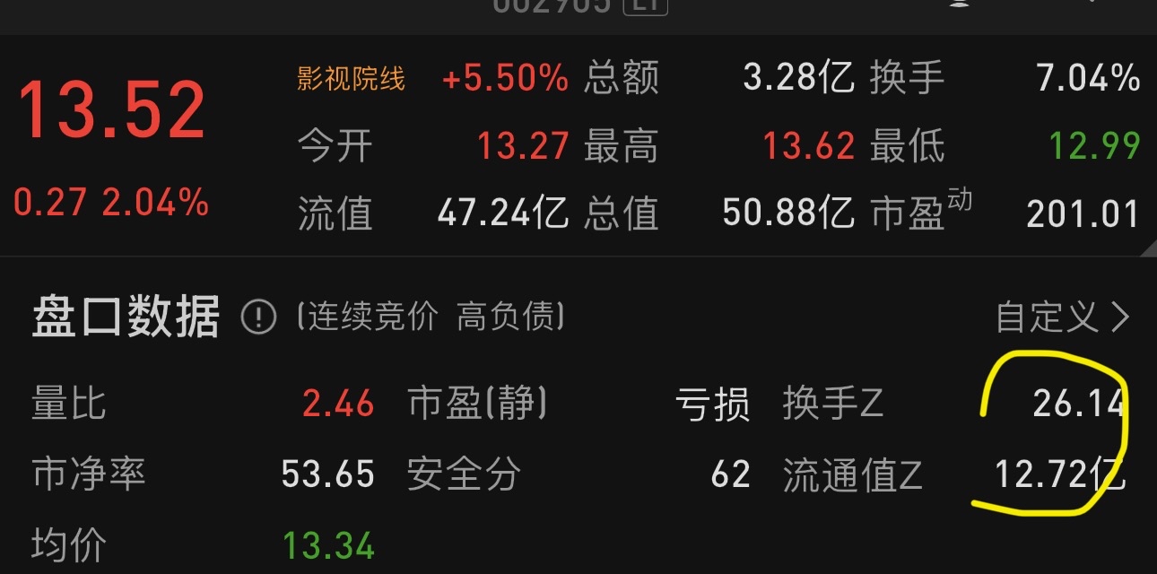 $金逸影视(SZ002905)$ 实际换手率到30就差不多了
