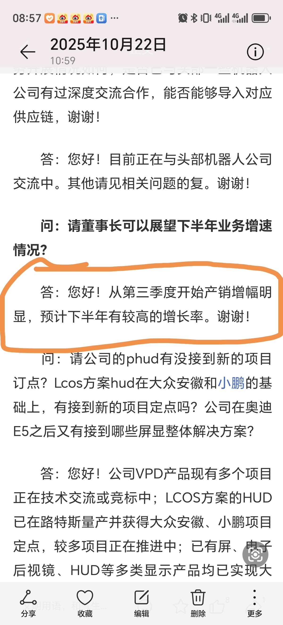 大家再仔细理解公司领导的这番话,预计今年下半年业绩有较高增长,这意味着四季度将继续高增长