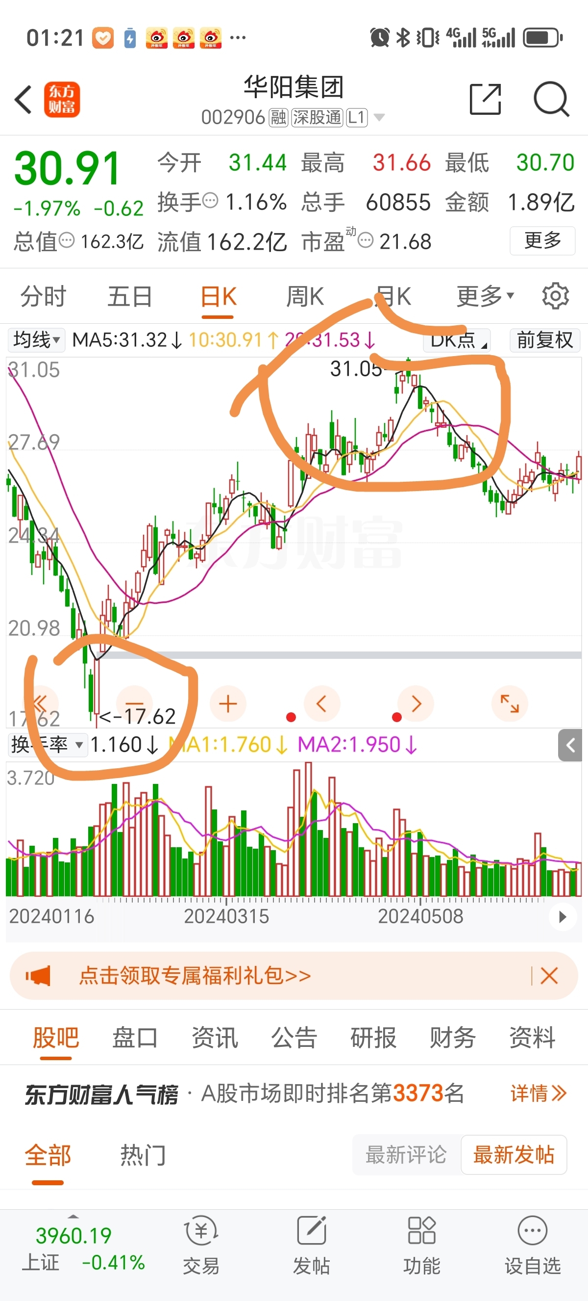 华阳集团在2024年上半年大熊市,因为一季报和半年报预期增长,光靠业绩股价都能涨到31元,如果不是大盘牛市资金被那些绩差题材股和伪科技股吸走,华阳集团光靠每季度业绩增长,在大盘2600点都能涨到50元左右,这下好了,大盘牛市从2600点涨到4000多点,华阳集团却比2600点预期还低了20元,真是讽刺呀!嘎嘎嘎。。。