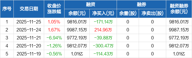 集泰股份:融资净偿还171.14万元,融资余额9816.01万元(11-25)