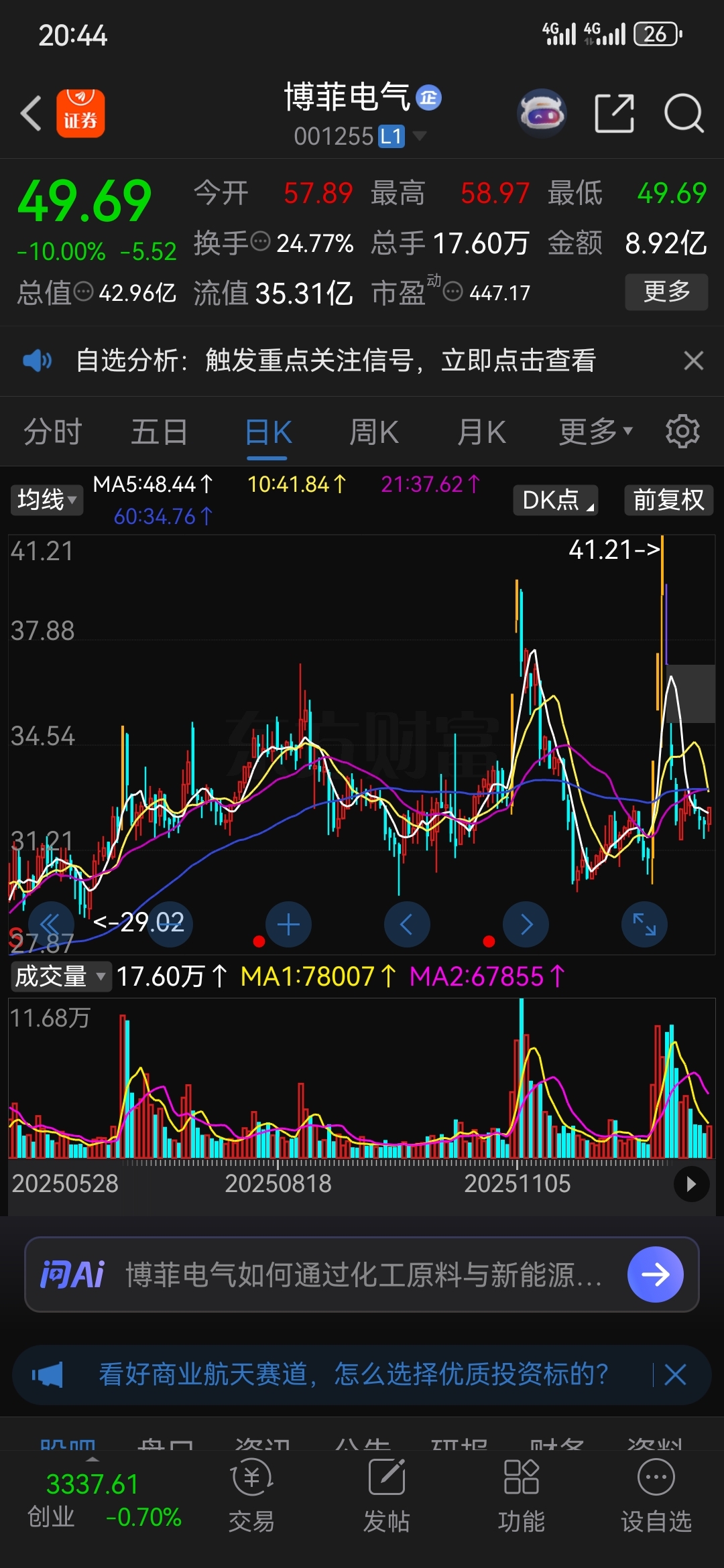 走势与博菲电气类似,能走出博飞的高度一半也行了。