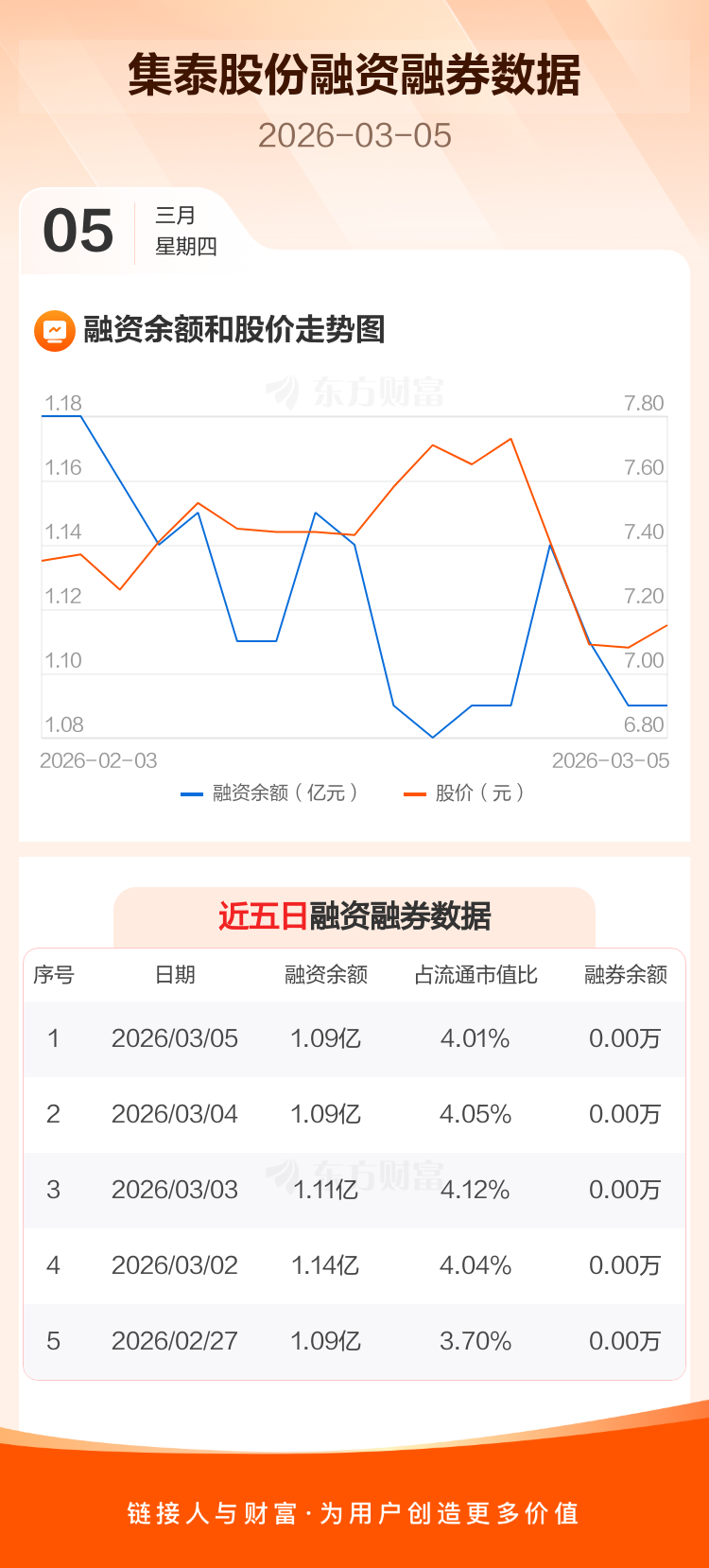 交易所最新数据显示,集泰股份于2026年3月5日获融资买入547.92万元,融资偿还555.94万元,当日融资净偿还8.03万元。目前,该股融资余额1.09亿,占流通市值比例为4.01%。