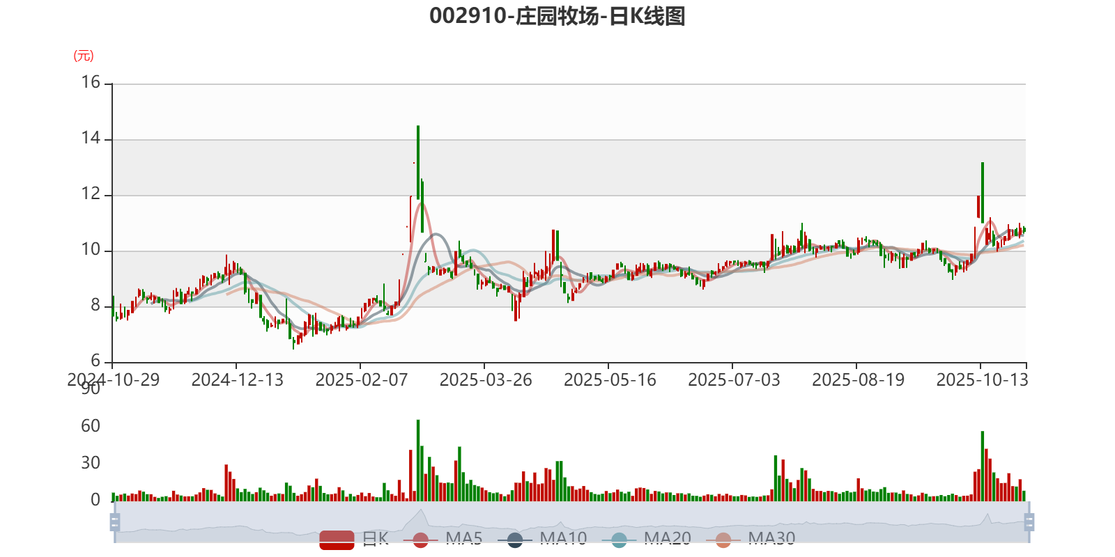 中证智能财讯庄园牧场(002910)10月29日披露2025年第三季度报告。前三季度公司实现营业总收入6.29亿元,同比下降3.10%;归母净利润亏损4844.08万元,上年同期亏损1.18亿元;扣非净利润亏损6823.63万元,上年同期亏损1.28亿元;经营活动产生的现金流量净额为1.11亿元,同比增长618.29%;报告期内,庄园牧场基本每股收益为-0.25元,加权平均净资产收益率为-4.54%。