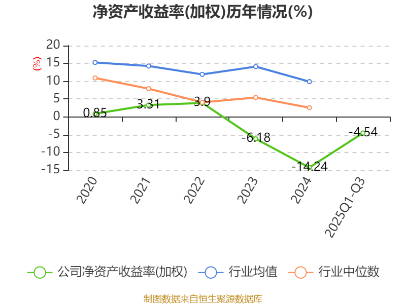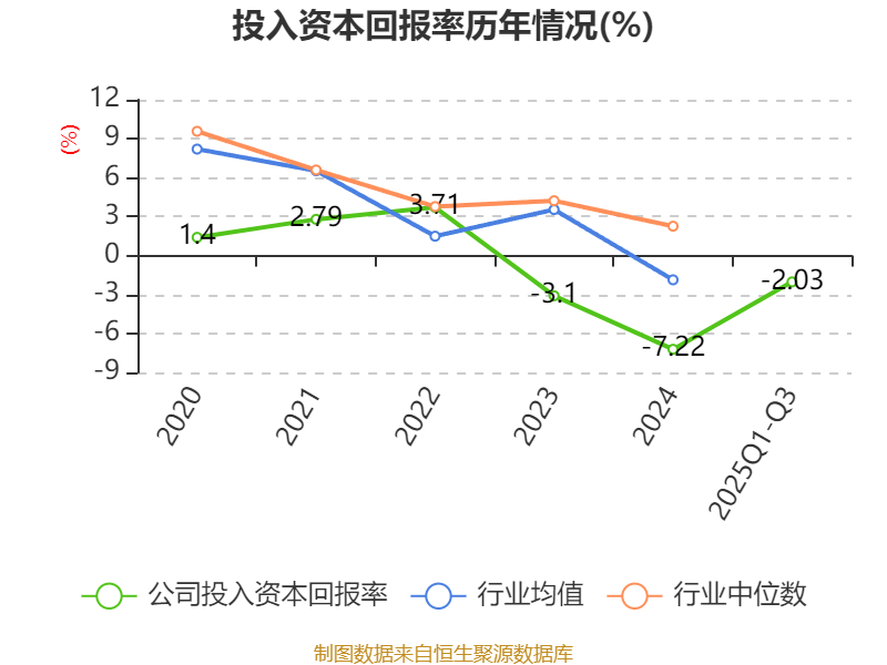 盈利能力方面, 2025年前三季度公司加权平均净资产收益率为-4.54%,同比上升5.27个百分点。公司2025年前三季度投入资本回报率为-2.03%,较上年同期上升3.08个百分点。