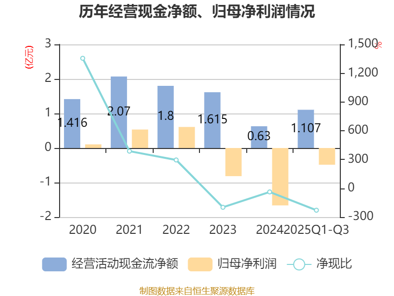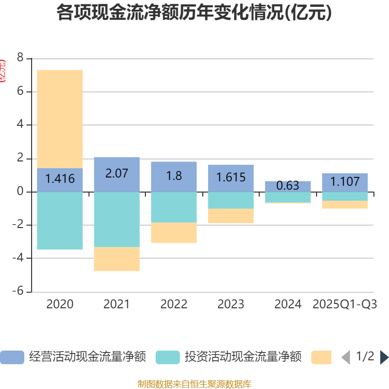 2025年前三季度,公司经营活动现金流净额为1.11亿元,同比增长618.29%;筹资活动现金流净额-4679.23万元,同比减少5309.66万元;投资活动现金流净额-5428.29万元,上年同期为-6828.53万元。