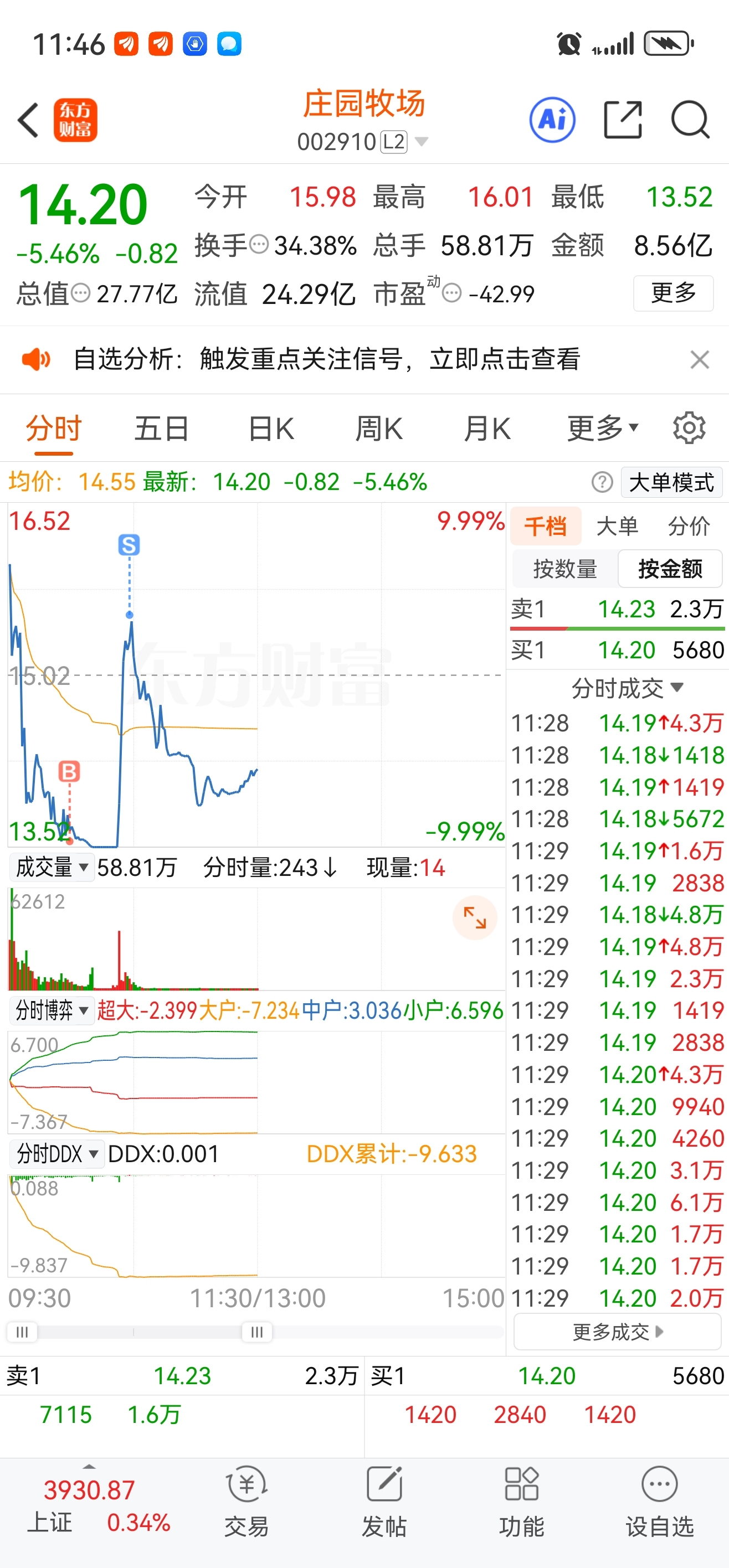 $庄园牧场(SZ002910)$ 老仓位三个多点跑了,确实有点拿不住了,剩下的扔着吧成本-14,这个量不对劲,还是看好能上20