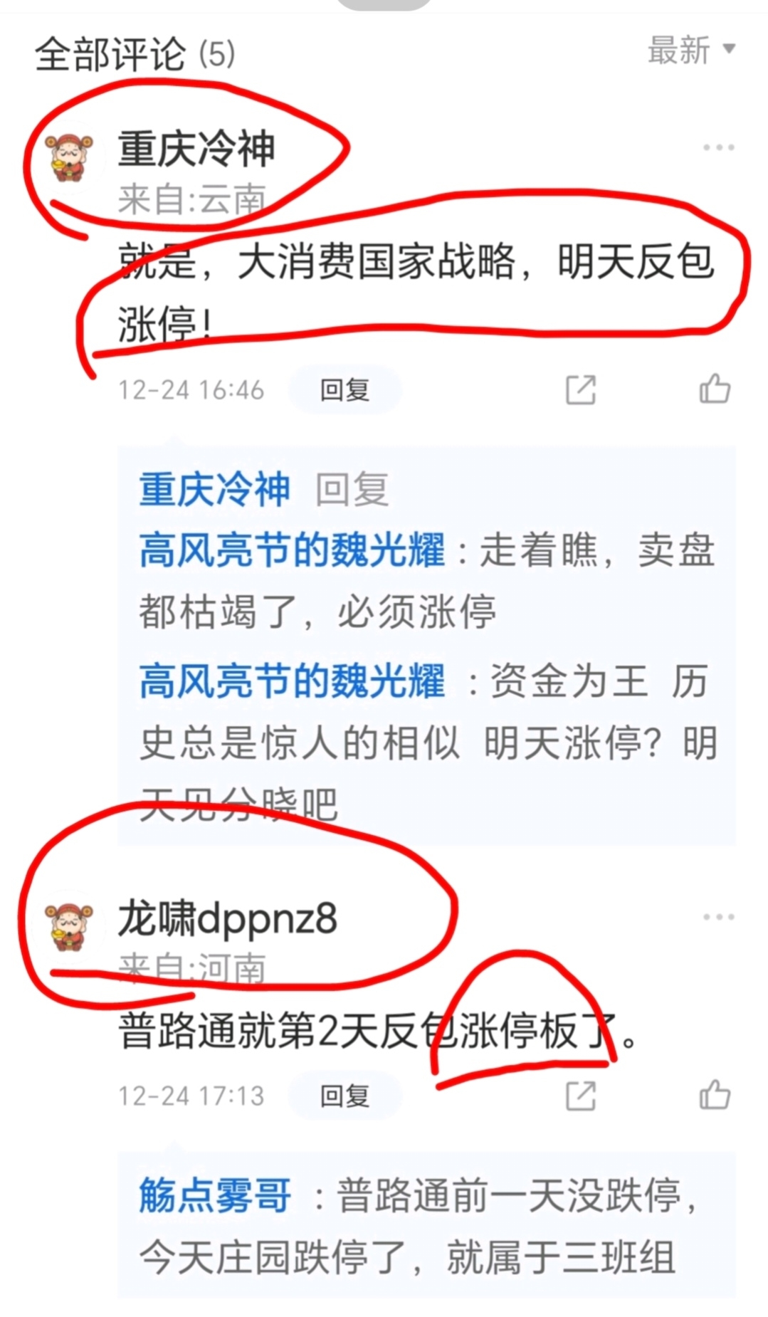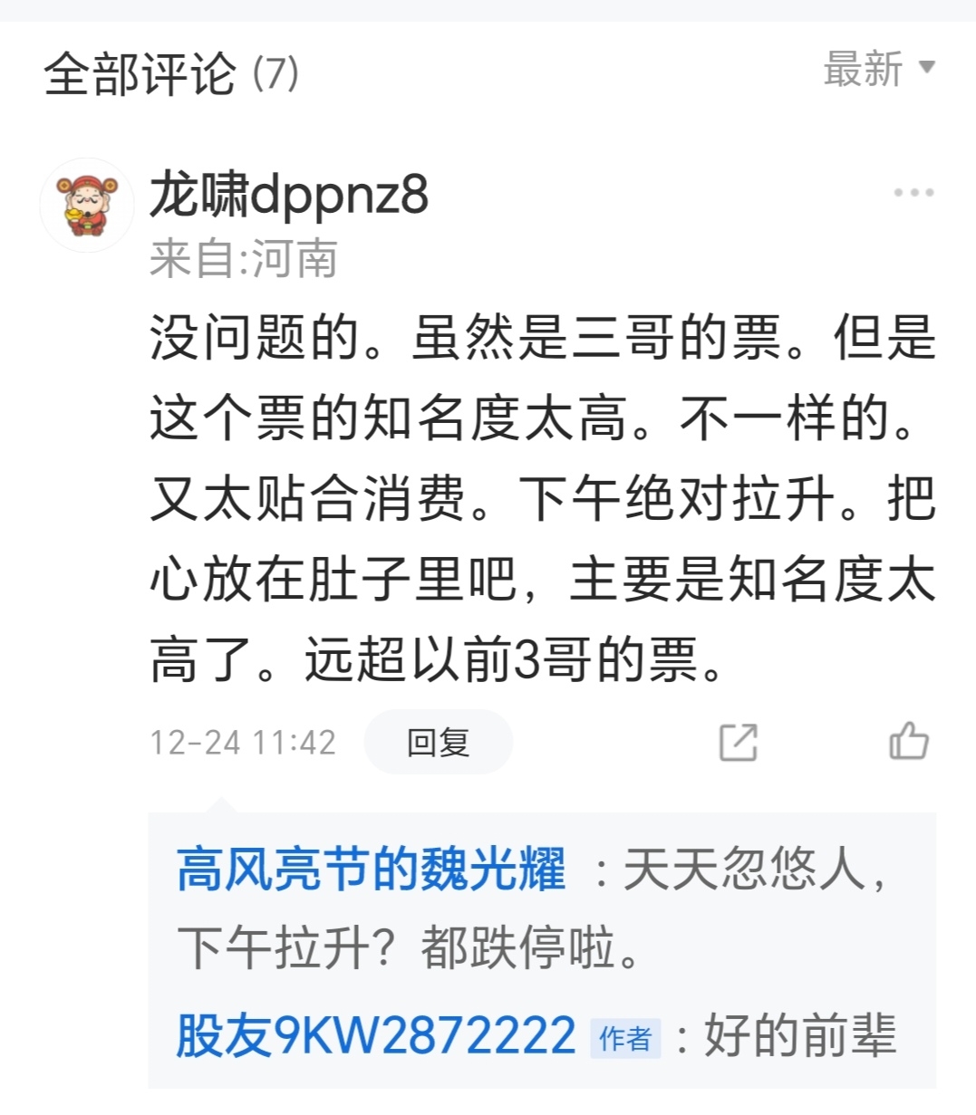 看看这2位大哥,欺骗大家接盘说今天涨停,大家多注意风险。我是觉得庄园的走势和洪兴