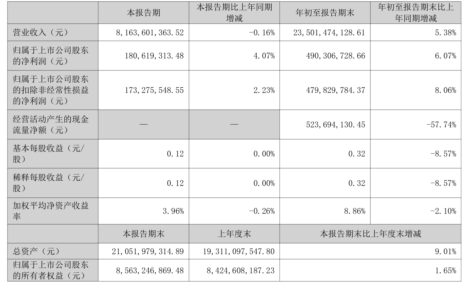 中证智能财讯佛燃能源(002911)10月17日披露2025年第三季度报告。前三季度公司实现营业总收入235.01亿元,同比增长5.38%;归母净利润4.9亿元,同比增长6.07%;扣非净利润4.8亿元,同比增长8.06%;经营活动产生的现金流量净额为5.24亿元,同比下降57.74%;报告期内,佛燃能源基本每股收益为0.32元,加权平均净资产收益率为8.86%。