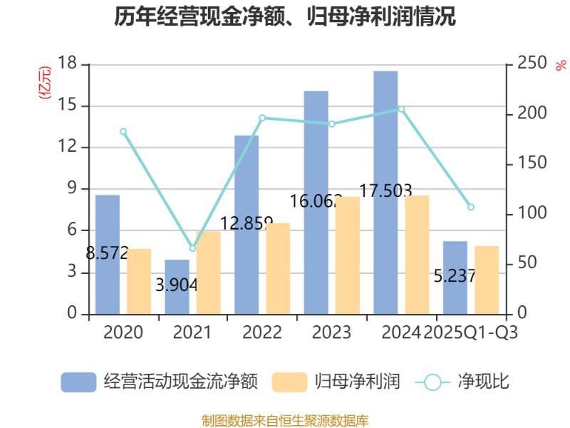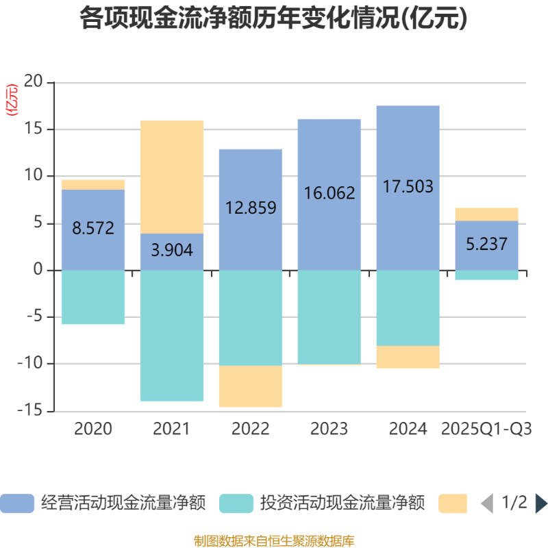 2025年前三季度,公司经营活动现金流净额为5.24亿元,同比下降57.74%;筹资活动现金流净额1.38亿元,同比减少5.42亿元;投资活动现金流净额-1.04亿元,上年同期为-4.93亿元。