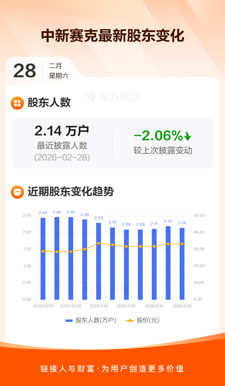中新赛克最新披露数据显示,截至2月28日公司股东户数为2.14万户,较上期(2026年2月13日)减少451户,降幅为2.06%。户均持有流通股数量由上期的7421股上升至7577股,户均持股金额由上期的24.65万元增加至25.22万元。