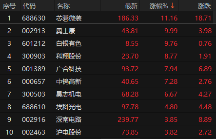 上证报中国证券网讯 1月21日早盘,PCB概念股震荡走强,截至10时05分,奥士康涨停,芯碁微装涨逾10%,白银有色接近涨停,科翔股份、广合科技等跟涨。