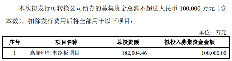公司本次募投项目“高端印制电路板项目”投资总额为18.20亿元,将围绕公司PCB主业,进一步布局建设高端PCB产能,项目建成并达产后将形成年产84万平方米高多层板及HDI板产能。