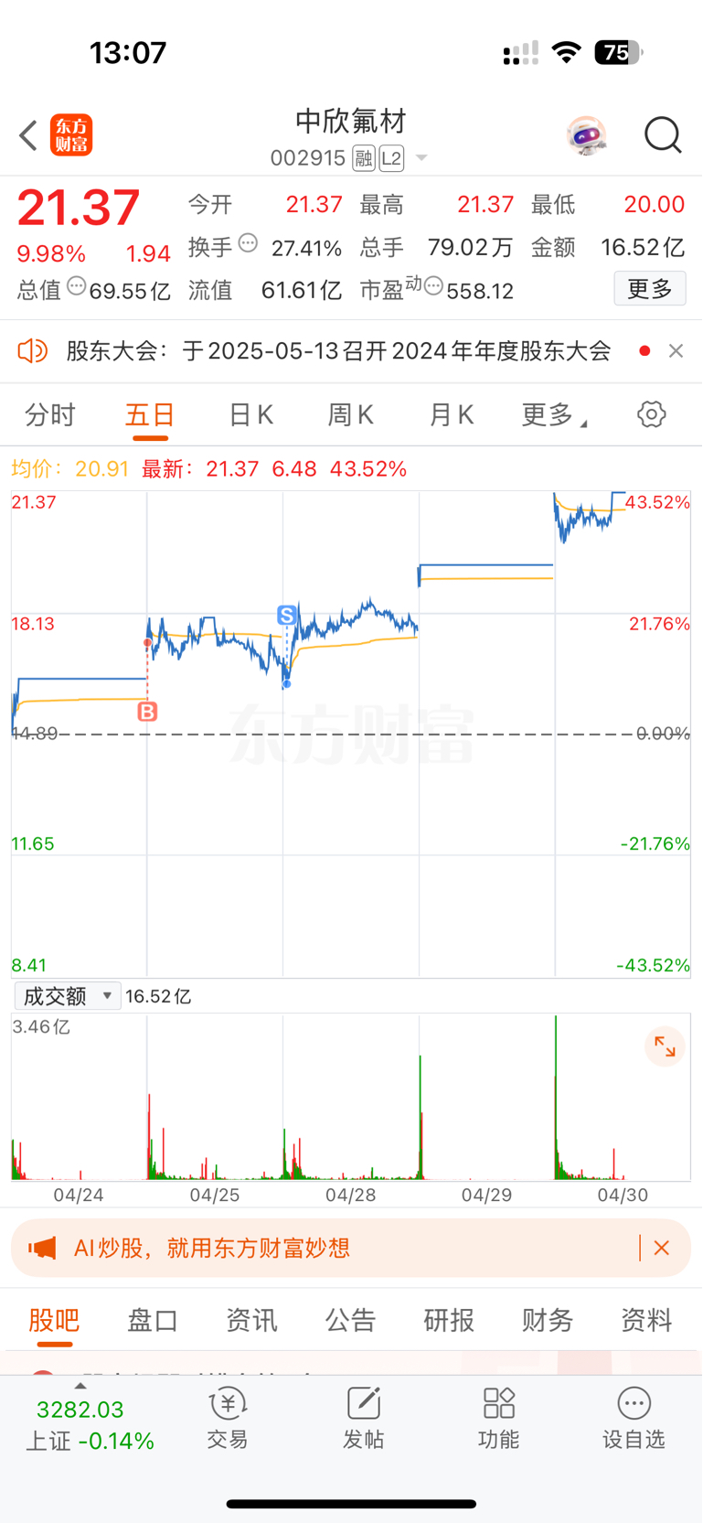 $中欣氟材(SZ002915)$ 我下了车,你却成了妖