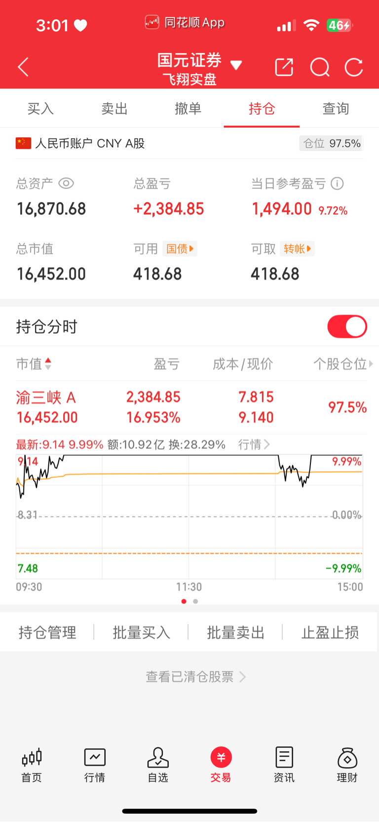 渝三峡格局了一天,市场情绪这么好,赚钱效应那么强,况且拿的还是连板破局龙,没有卖出的理由啊,无非就是吃一个跌停呗,但是上升周期不敢博,难道等下降周期猛猛干吗,相信这两天就有老师帮我们吹了,一切都会回来的,谢谢一路相伴的朋友们~$中欣氟材(SZ002915)$ $渝三峡A(SZ000565)$ $中毅达(SH600610)$