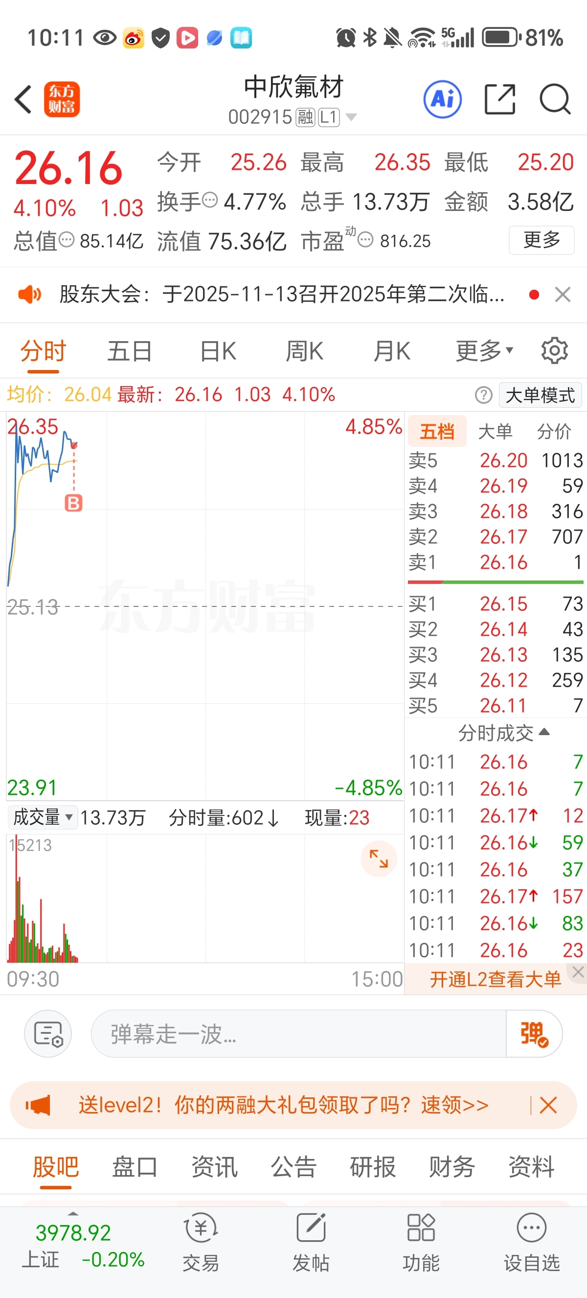 $中欣氟材(SZ002915)$ 站稳26,开始新一轮大涨!加仓买进!