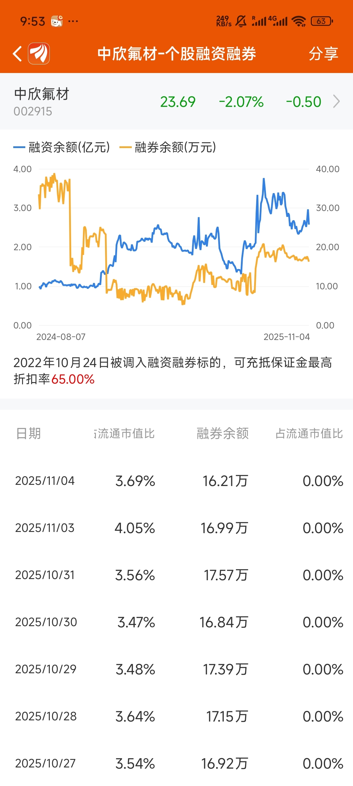 $中欣氟材(SZ002915)$ 这是都开始融券做空了